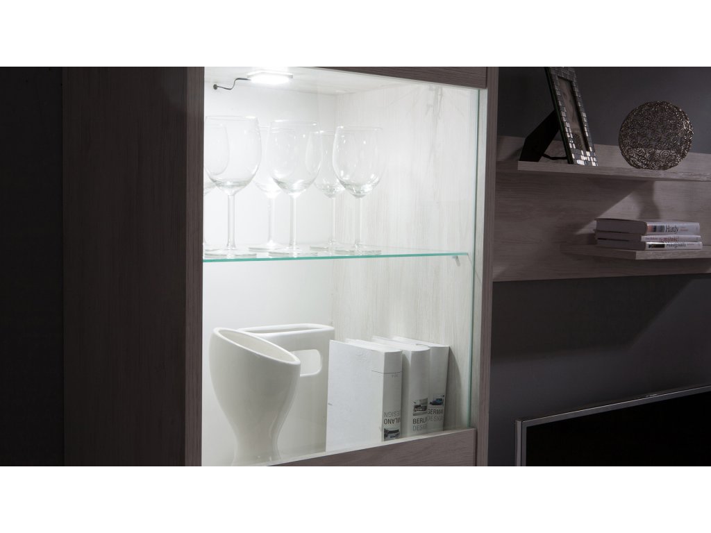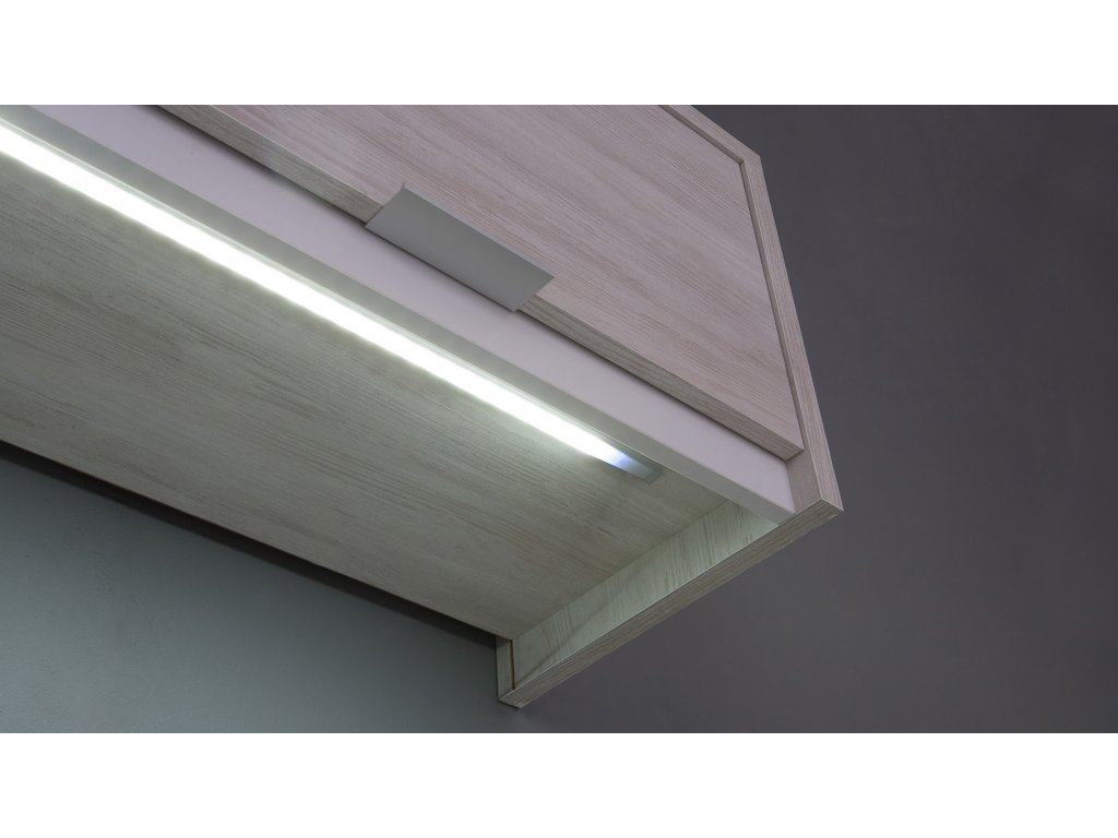 Kovové úchytky v nábytkových skříňkách a zásuvkách se vyznačují vysokou odolností a pevností. Volitelné osvětlení se vztahuje i na skříň, posuvné skříně a univerzální vitrínu.