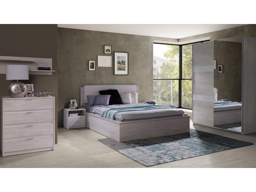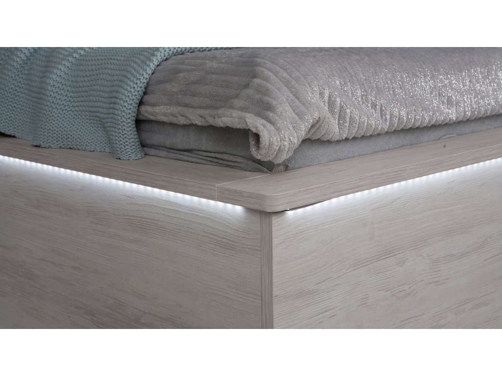Pohodlná a pevně ustlaná postel má kovový rám a velký kontejner na lůžkoviny. Čelo postele zdobí čalouněná vložka z prošívané látky připomínající kůži, díky které celá postel působí velmi efektně. Ještě lepšího efektu lze dosáhnout, když je nasvítíme - k tomuto účelu navíc nabízíme LED pásek, který osvětlí boky a čelo nábytku. Můžete si také zakoupit lampy na čtení namontované na čelo postele.