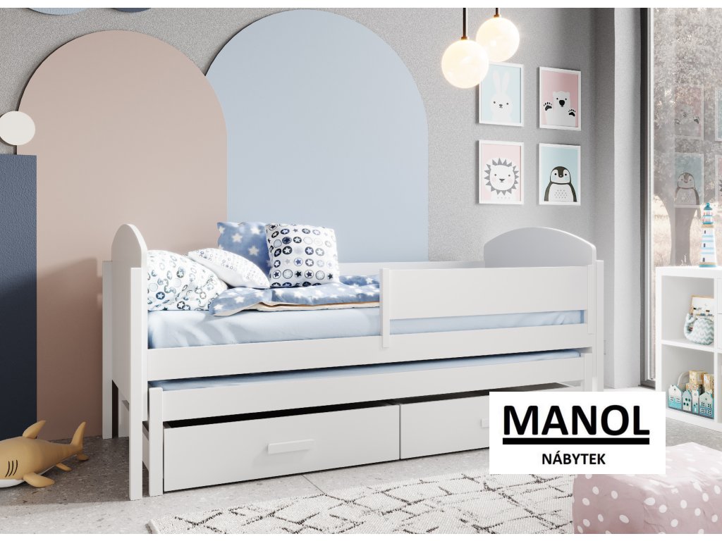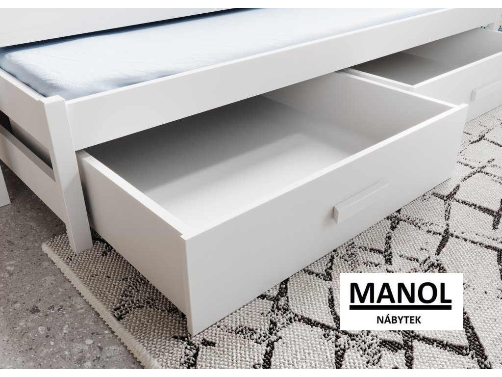 Dětská manželská postel Olen je kombinací moderního designu a výjimečné funkčnosti, která je ideální pro ty, kdo oceňují praktická řešení v dětském pokoji. Je vyrobena z vysoce kvalitních materiálů a zaručuje odolnost a komfort při používání. Díky funkci výsuvné matrace lze postel snadno přeměnit na prostor pro další osobu, což z ní činí vynikající volbu pro dětské pokoje a pokoje pro hosty. Praktické dvě objemné zásuvky, které se nacházejí ve spodní části postele, poskytují další úložný prostor pro lůžkoviny, oblečení nebo jiné doplňky. Pevná konstrukce z odolných materiálů zaručuje stabilitu a dlouhou životnost nábytku.Doplňkové parametry