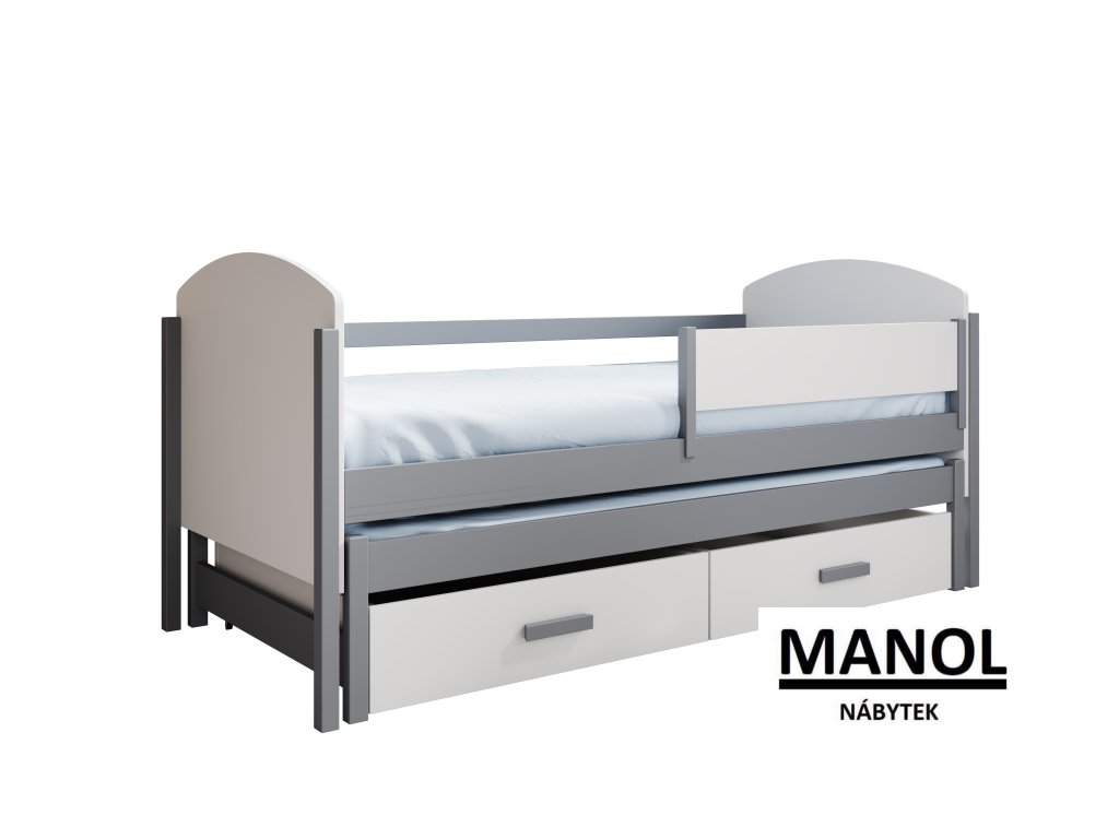 Dětská manželská postel Olen je kombinací moderního designu a výjimečné funkčnosti, která je ideální pro ty, kdo oceňují praktická řešení v dětském pokoji. Je vyrobena z vysoce kvalitních materiálů a zaručuje odolnost a komfort při používání. Díky funkci výsuvné matrace lze postel snadno přeměnit na prostor pro další osobu, což z ní činí vynikající volbu pro dětské pokoje a pokoje pro hosty. Praktické dvě objemné zásuvky, které se nacházejí ve spodní části postele, poskytují další úložný prostor pro lůžkoviny, oblečení nebo jiné doplňky. Pevná konstrukce z odolných materiálů zaručuje stabilitu a dlouhou životnost nábytku.Doplňkové parametry