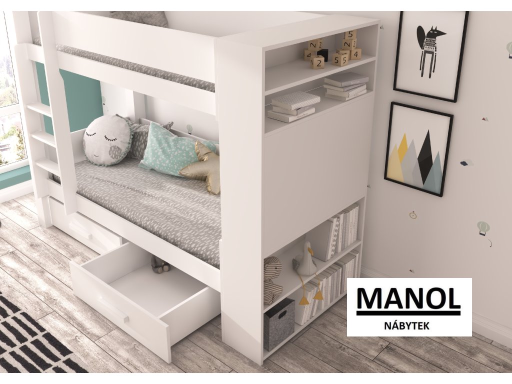Patrová postel GARET pro 2 osoby je skvělým nápadem, jak ušetřit místo v malém dětském pokoji. Nábytek má schůdky a dvě prostorné a funkční zásuvky na lůžkoviny. Kromě toho jsou na dvou úrovních zábradlí pro zvýšení bezpečnosti během spánku. Model GARET má police na vnitřní i vnější straně postele. Matrace nejsou součástí soupravy postele.Doplňkové parametry