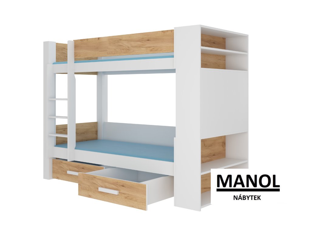Patrová postel GARET pro 2 osoby je skvělým nápadem, jak ušetřit místo v malém dětském pokoji. Nábytek má schůdky a dvě prostorné a funkční zásuvky na lůžkoviny. Kromě toho jsou na dvou úrovních zábradlí pro zvýšení bezpečnosti během spánku. Model GARET má police na vnitřní i vnější straně postele. Matrace nejsou součástí soupravy postele.Doplňkové parametry