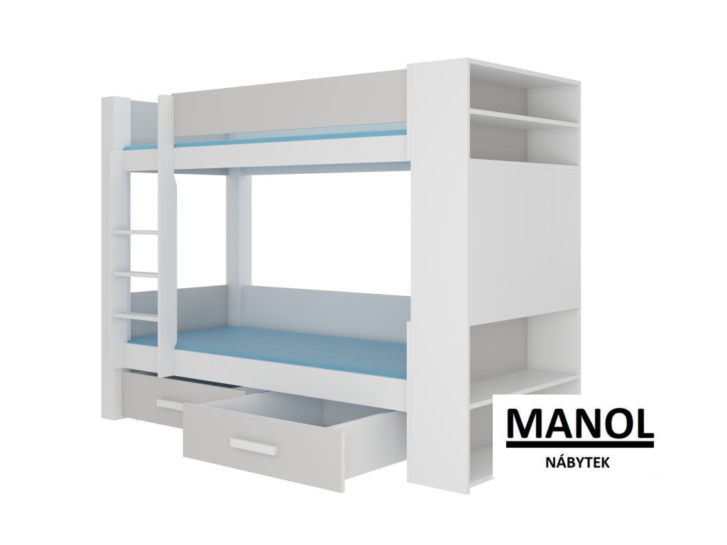 Patrová postel GARET pro 2 osoby je skvělým nápadem, jak ušetřit místo v malém dětském pokoji. Nábytek má schůdky a dvě prostorné a funkční zásuvky na lůžkoviny. Kromě toho jsou na dvou úrovních zábradlí pro zvýšení bezpečnosti během spánku. Model GARET má police na vnitřní i vnější straně postele. Matrace nejsou součástí soupravy postele.Doplňkové parametry