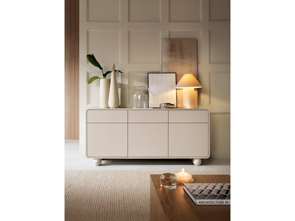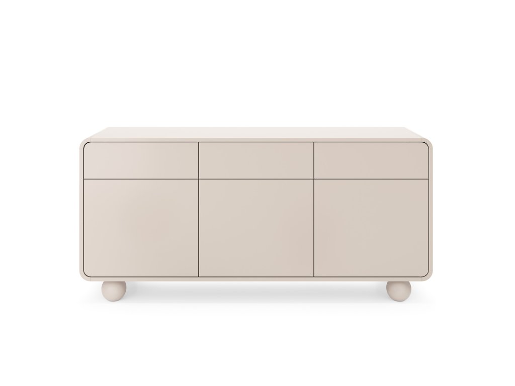 Moderní komoda v elegantním kašmírovém odstínu zaujme svým nadčasovým vzhledem a jemnými zaoblenými liniemi. Díky minimalistickému designu se snadno začlení do obývacího pokoje, ložnice i jídelny a vytvoří harmonický základ interiéru.