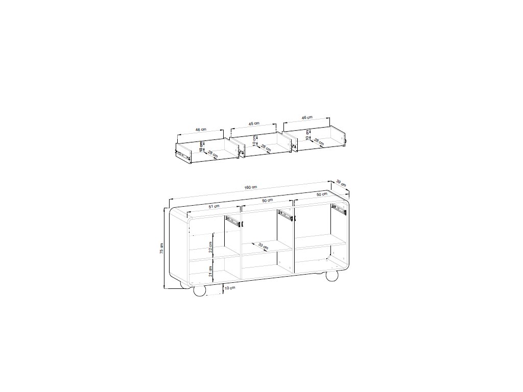 Stabilní konstrukce je doplněna o designové kulaté nožky, které dodávají nábytku lehkost a moderní charakter a zároveň umožňují snadný úklid pod komodou. Hladká čela bez úchytek podtrhují elegantní a čistý vzhled.