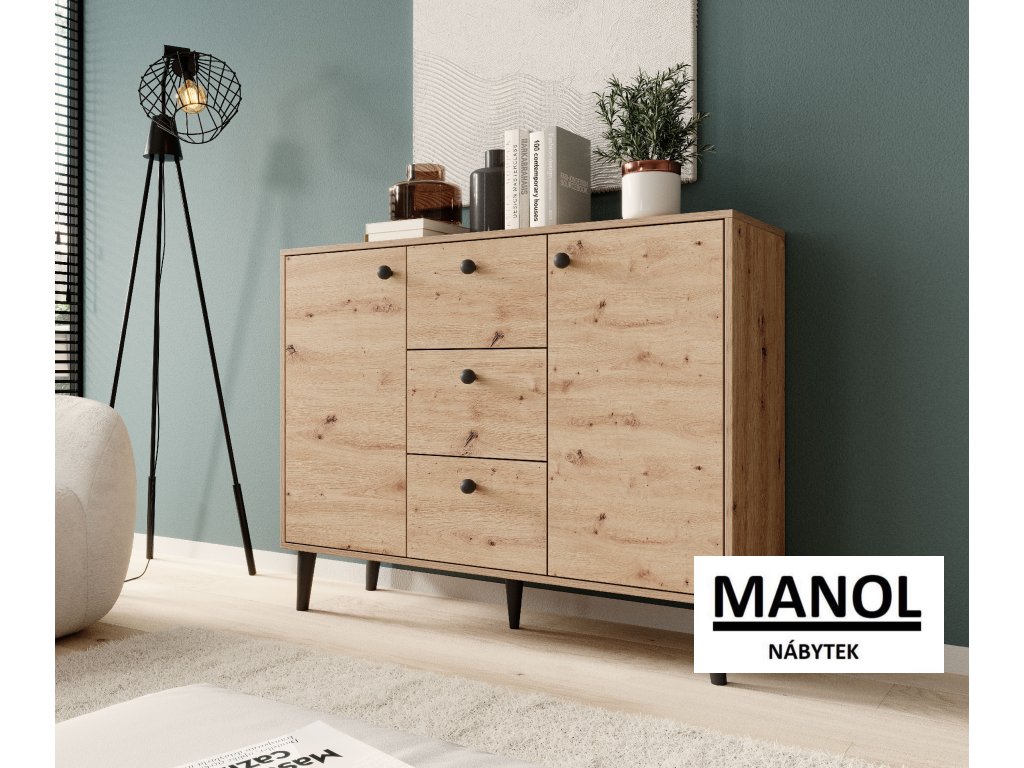 Komoda BESA je dokonalou kombinací minimalistického designu a lehkých tvarů. Půvab jí dodávají vysoké dřevěné nohy, díky nimž je konstrukce stabilní a pevná. Tři objemné zásuvky vám umožní schovat drobné předměty nebo dokumenty, zatímco dvě boční skříňky s policí uprostřed dodají další prostor. Komoda BESA se bude skvěle hodit do obývacího pokoje, ložnice nebo předsíně.Doplňkové parametry