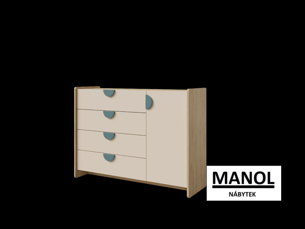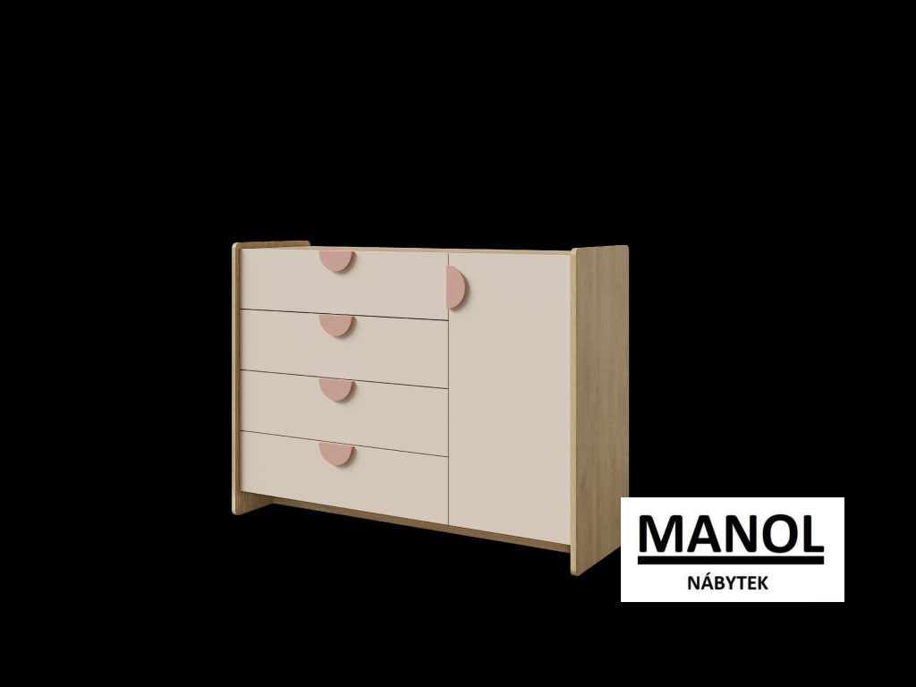 Nábytek je vyroben z kvalitního lamina, které je odolné vůči každodennímu používání a nenáročné na údržbu. Hrany jsou opatřeny ABS páskou pro vyšší ochranu proti poškození a delší životnost. Zásuvky jsou vybaveny výsuvnými kolejnicemi s kuličkovými ložisky GTV H35, které zajišťují plynulé, tiché a spolehlivé otevírání.