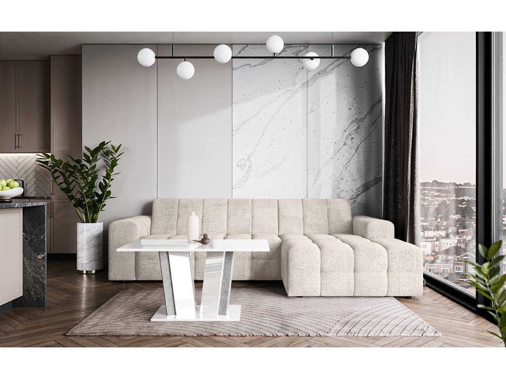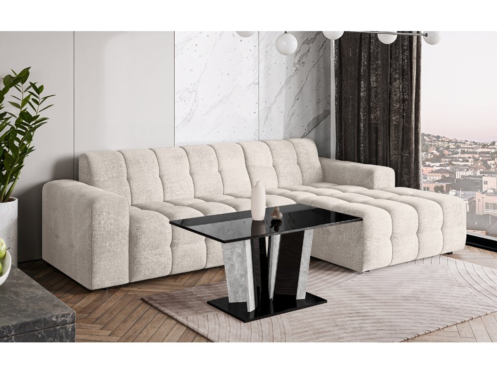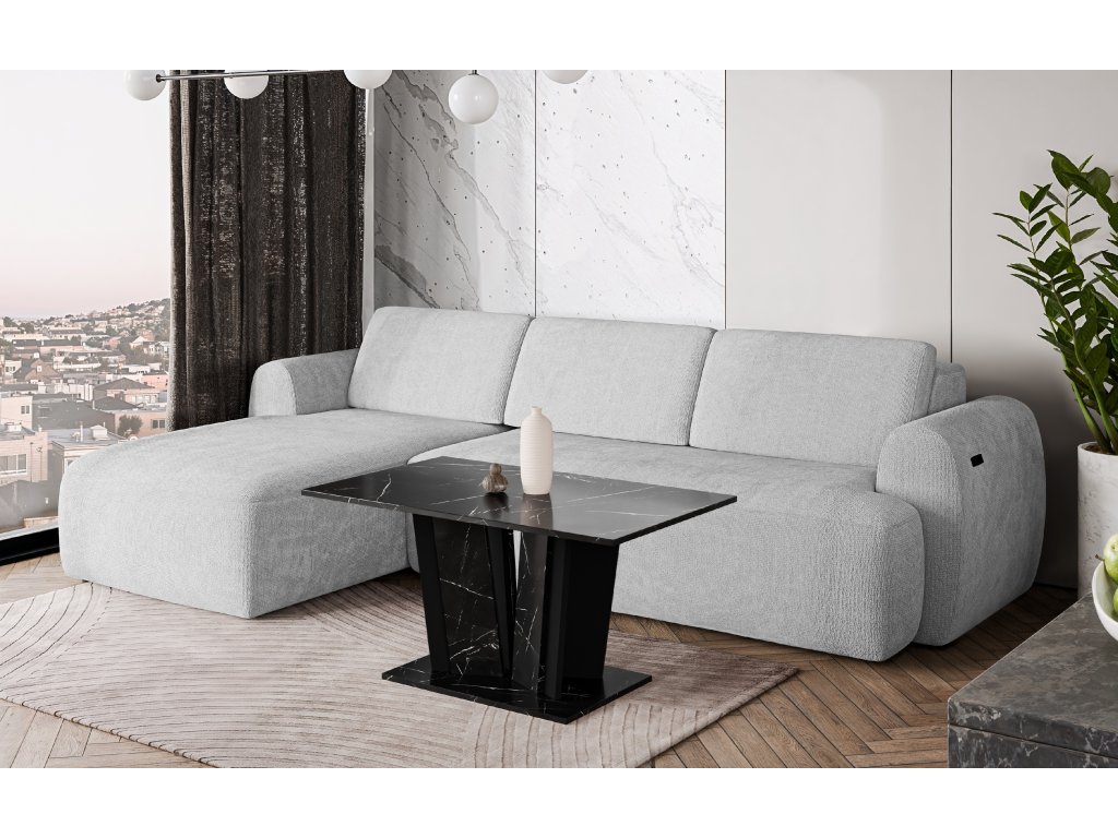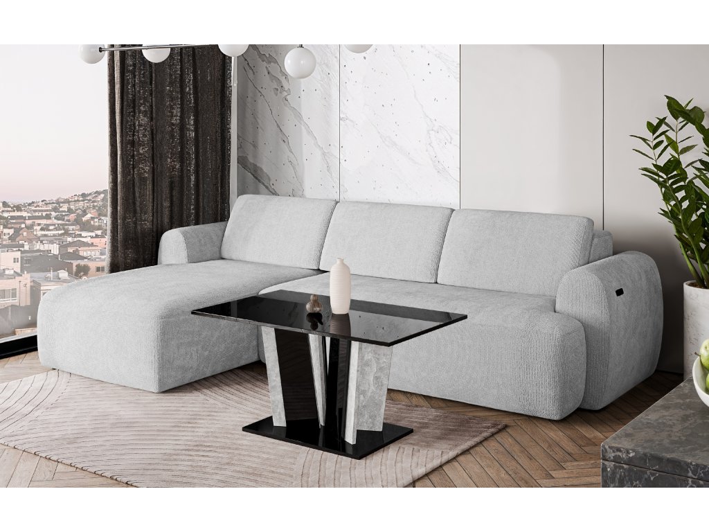 Pevná základna garantuje vysokou stabilitu a dlouhou životnost i při pravidelném zatížení. Moderní kombinace lesklých a kamenných dekorů dodává stolku luxusní vzhled a činí z něj výrazný designový prvek každého obývacího prostoru.