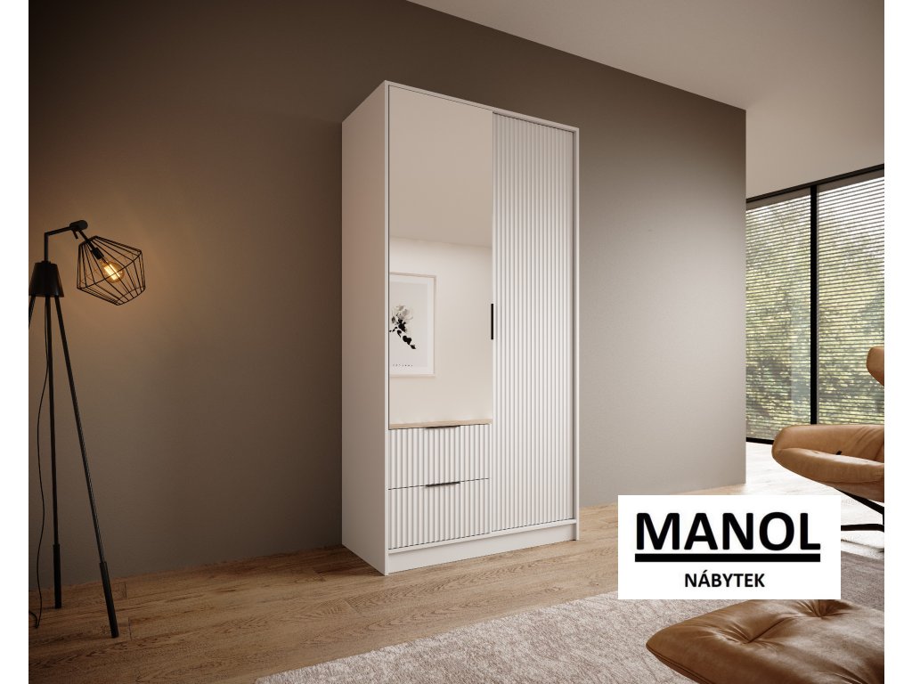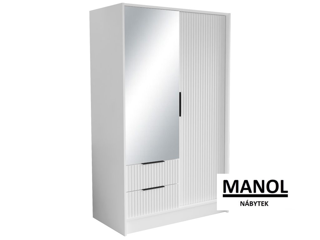 Šatní skříň Norel je kus nábytku, který se vyznačuje elegancí a moderním designem. Její drážkovaná struktura jí dodává sofistikovaný vzhled a zároveň dodává místnosti určitou strukturu a hloubku. Ústředním bodem je velké zrcadlo, které nejenže dodává prostor, ale má také praktickou funkci, protože umožňuje zkontrolovat váš vzhled před odchodem ven.Doplňkové parametry