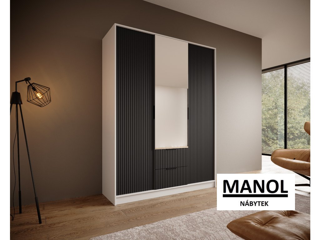 Šatní skříň Norel je kus nábytku, který se vyznačuje elegancí a moderním designem. Její drážkovaná struktura jí dodává sofistikovaný vzhled a zároveň dodává místnosti určitou strukturu a hloubku. Ústředním bodem je velké zrcadlo, které nejenže dodává prostor, ale má také praktickou funkci, protože umožňuje zkontrolovat váš vzhled před odchodem ven.Doplňkové parametry