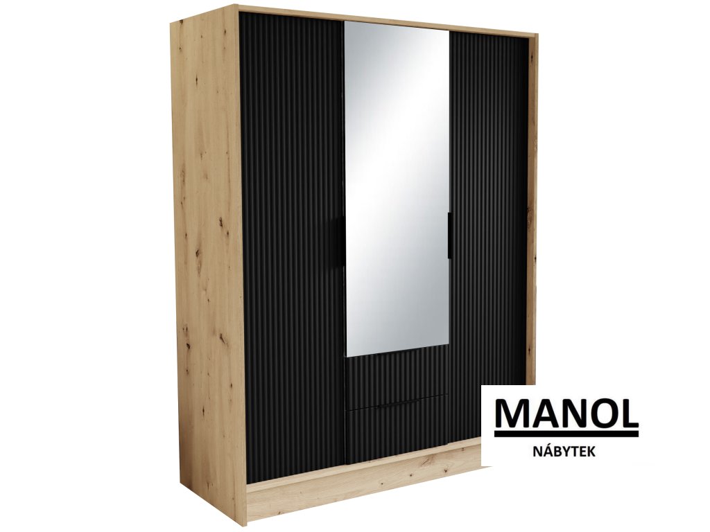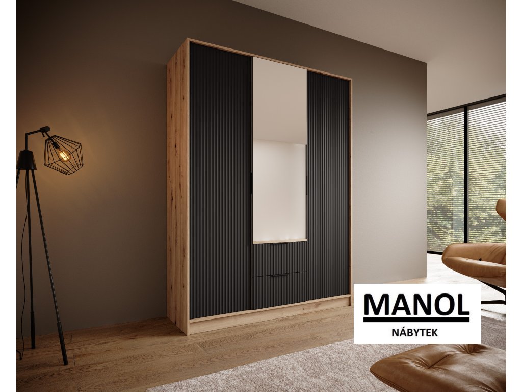 Šatní skříň Norel je kus nábytku, který se vyznačuje elegancí a moderním designem. Její drážkovaná struktura jí dodává sofistikovaný vzhled a zároveň dodává místnosti určitou strukturu a hloubku. Ústředním bodem je velké zrcadlo, které nejenže dodává prostor, ale má také praktickou funkci, protože umožňuje zkontrolovat váš vzhled před odchodem ven.Doplňkové parametry