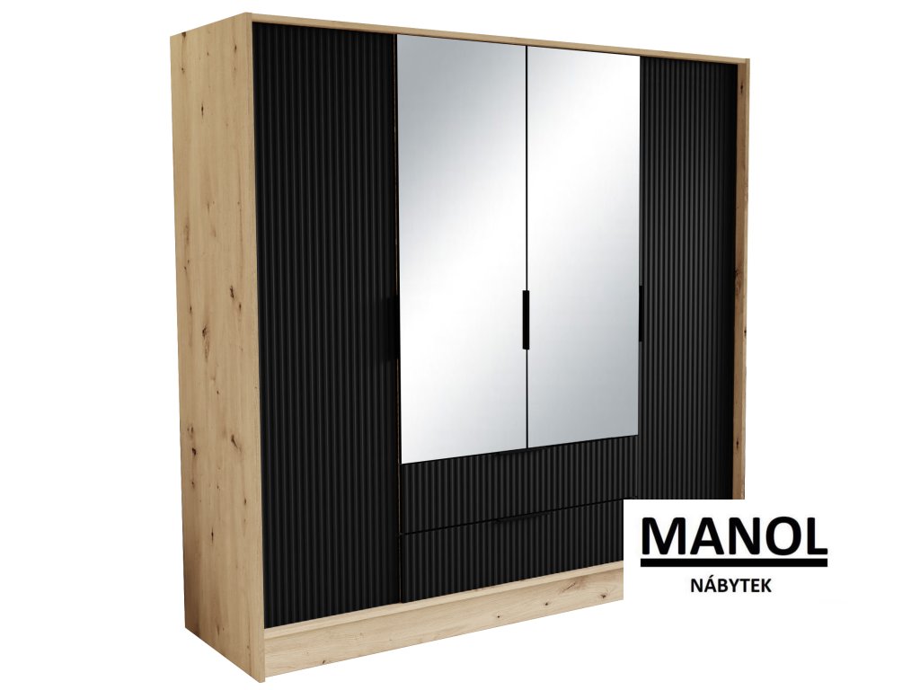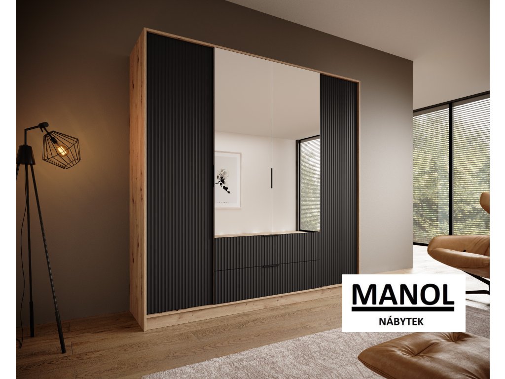 Šatní skříň Norel je kus nábytku, který se vyznačuje elegancí a moderním designem. Její drážkovaná struktura jí dodává sofistikovaný vzhled a zároveň dodává místnosti určitou strukturu a hloubku. Ústředním bodem je velké zrcadlo, které nejenže dodává prostor, ale má také praktickou funkci, protože umožňuje zkontrolovat váš vzhled před odchodem ven.Doplňkové parametry