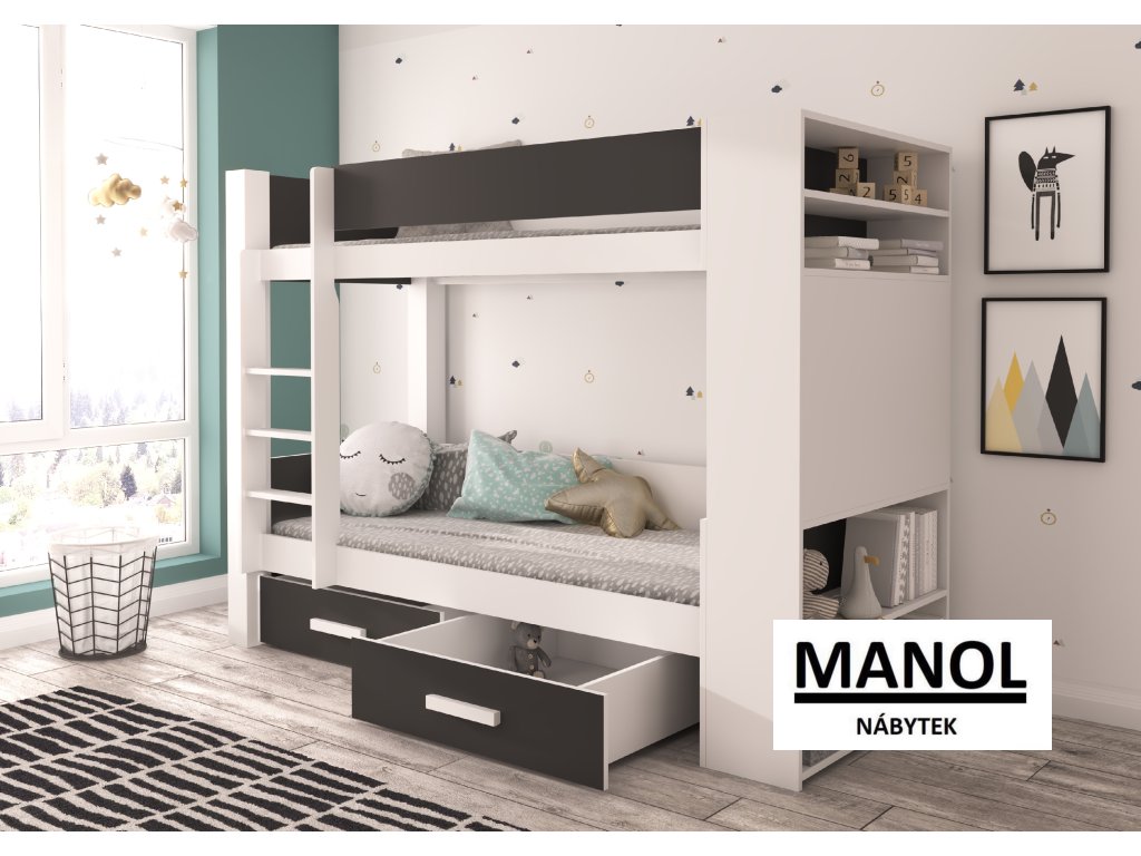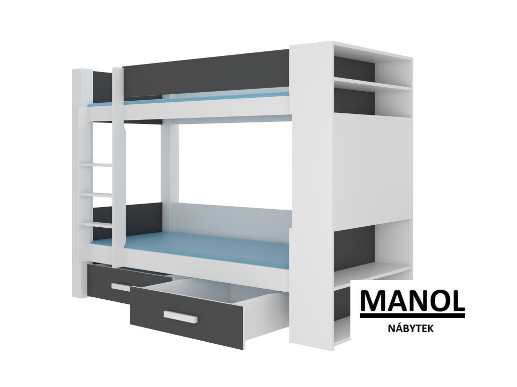 Patrová postel GARET pro 2 osoby je skvělým nápadem, jak ušetřit místo v malém dětském pokoji. Nábytek má schůdky a dvě prostorné a funkční zásuvky na lůžkoviny. Kromě toho jsou na dvou úrovních zábradlí pro zvýšení bezpečnosti během spánku. Model GARET má police na vnitřní i vnější straně postele. Matrace nejsou součástí soupravy postele.Doplňkové parametry