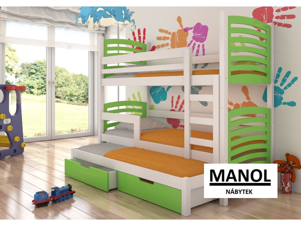 Patrová třípostelová postel SORIA je skvělým nápadem na úsporu místa v malém dětském pokoji. Nábytek má stabilní schodovou žebřík a ochranné zábrany umístěné téměř po celé délce postele, díky čemuž máte jistotu, že vaše dítě bude během spánku zcela v bezpečí. Navíc se na spodní části nacházejí dvě prostorné a funkční zásuvky na ložní prádlo. Společně s postelí obdržíte kompletní sadu tří pěnových matrací s bavlněnými potahy, které lze snadno sundat a vyprat.Doplňkové parametry