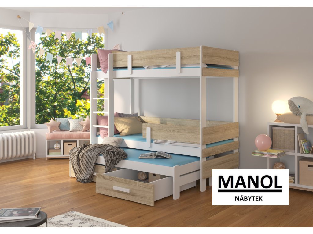 Patrová postel ETAPO pro 3 osoby je skvělým nápadem, jak ušetřit místo v malém dětském pokoji. Nábytek má schůdky a dvě prostorné a funkční zásuvky na lůžkoviny. Kromě toho jsou na dvou úrovních zábradlí pro zvýšení bezpečnosti během spánku. Matrace není součástí postele.Doplňkové parametry