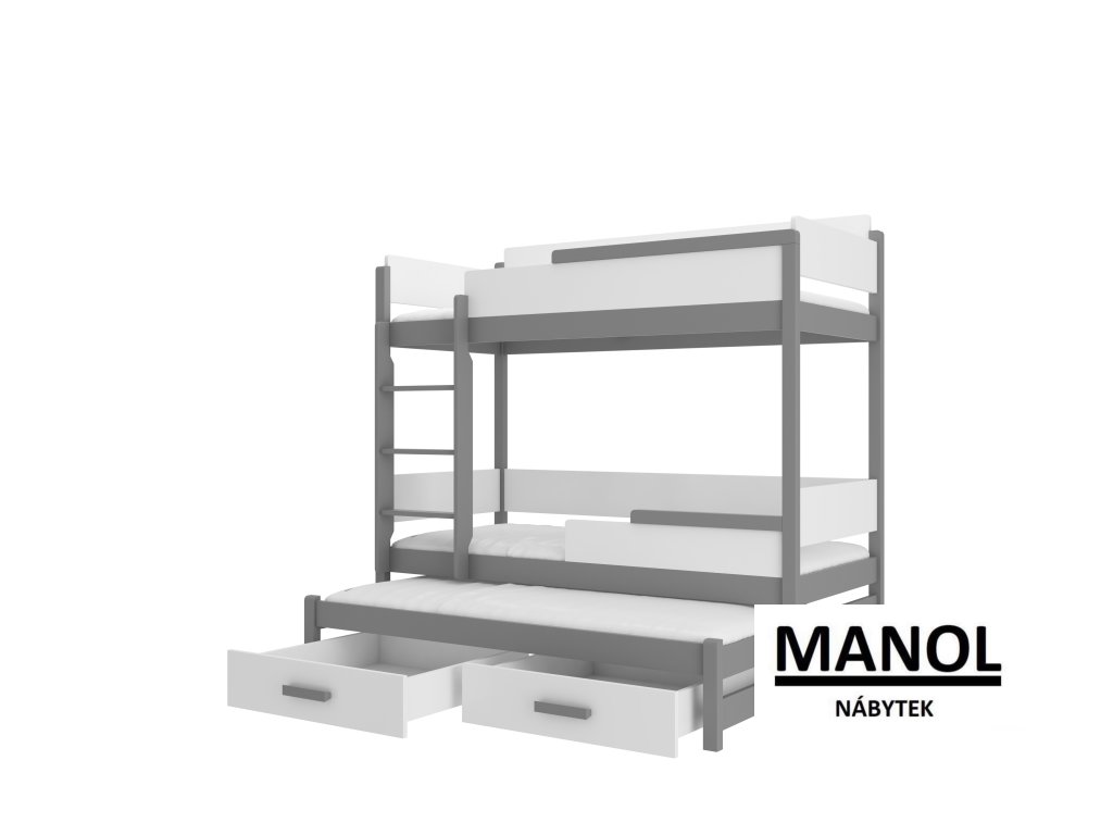 Patrová postel QUEEN pro 3 osoby je skvělým nápadem, jak ušetřit místo v malém dětském pokoji. Nábytek má schůdky a dvě prostorné a funkční zásuvky na lůžkoviny. Matrace nejsou součástí postele.Doplňkové parametry