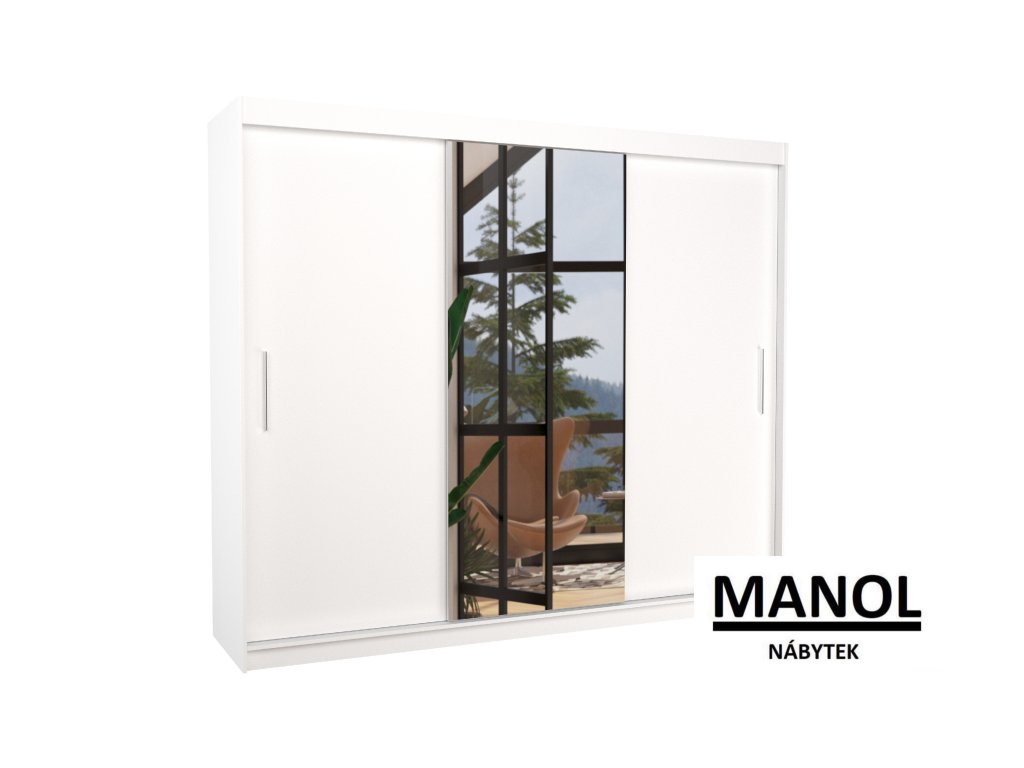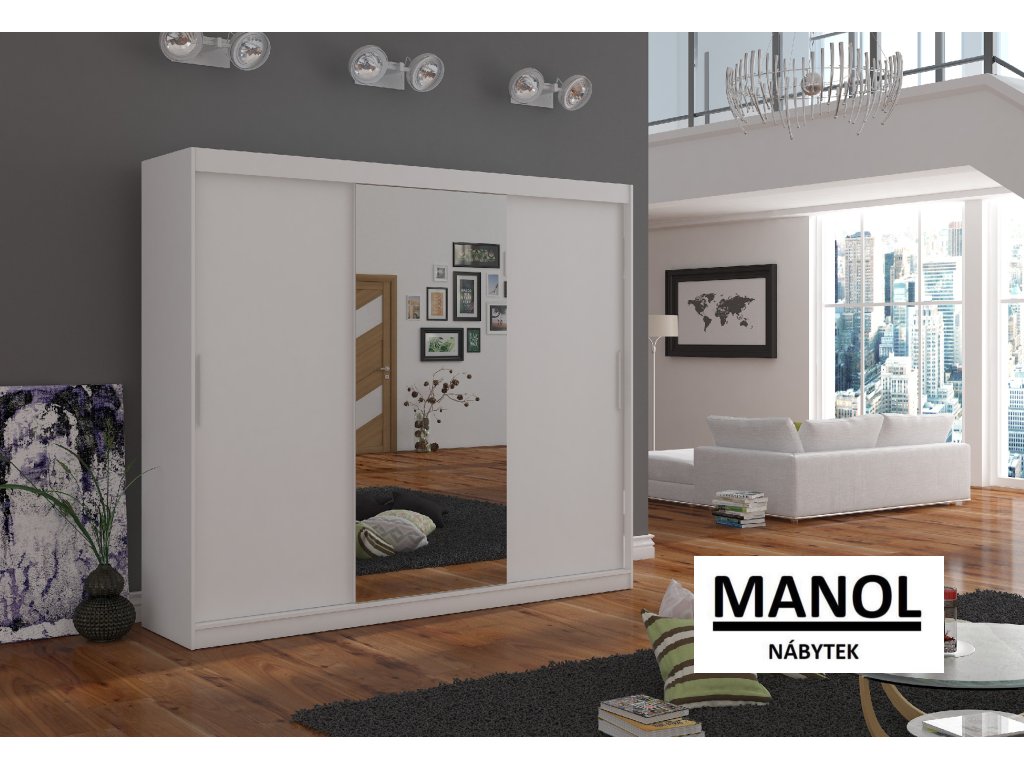 Posuvná šatní skříň DENIS se zrcadlem je ideálním způsobem, jak uspořádat svůj prostor. Nábytek je vybaven prostornými policemi a tyčí, na kterou můžete zavěsit šaty, obleky, svrchní oblečení nebo košile. Na přední straně je připevněno zrcadlo, které opticky zvětšuje prostor. Díky tomu, že je skříň posuvná, nemusíte pro otevírání dveří vyčlenit další prostor, což z ní činí ideální řešení pro malé místnosti nebo úzké chodby.Doplňkové parametry
