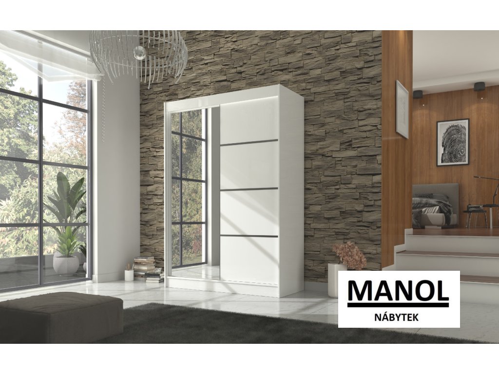 Posuvná šatní skříň GILTON se zrcadlem představuje ideální způsob, jak uspořádat svůj prostor. Nábytek je vybaven prostornými policemi a tyčí, na kterou můžete zavěsit šaty, obleky, svrchní oblečení nebo košile. Na přední straně se nachází zrcadlo a ozdobné pruhy, které dodávají jedinečný styl. Díky tomu, že je skříň posuvná, nemusíte pro otevírání dveří vyčlenit další prostor, což z ní dělá ideální řešení pro malé místnosti nebo úzké chodby.Doplňkové parametry