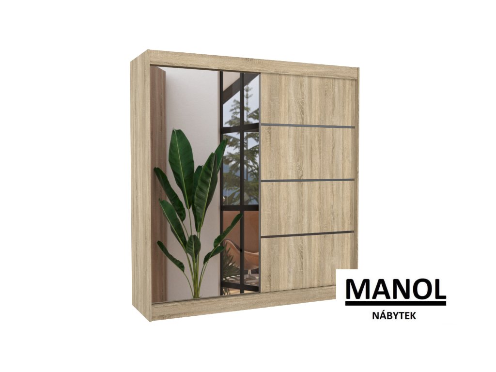 Posuvná šatní skříň GILTON se zrcadlem představuje ideální způsob, jak uspořádat svůj prostor. Nábytek je vybaven prostornými policemi a tyčí, na kterou můžete zavěsit šaty, obleky, svrchní oblečení nebo košile. Na přední straně se nachází zrcadlo a ozdobné pruhy, které dodávají jedinečný styl. Díky tomu, že je skříň posuvná, nemusíte pro otevírání dveří vyčlenit další prostor, což z ní dělá ideální řešení pro malé místnosti nebo úzké chodby.Doplňkové parametry