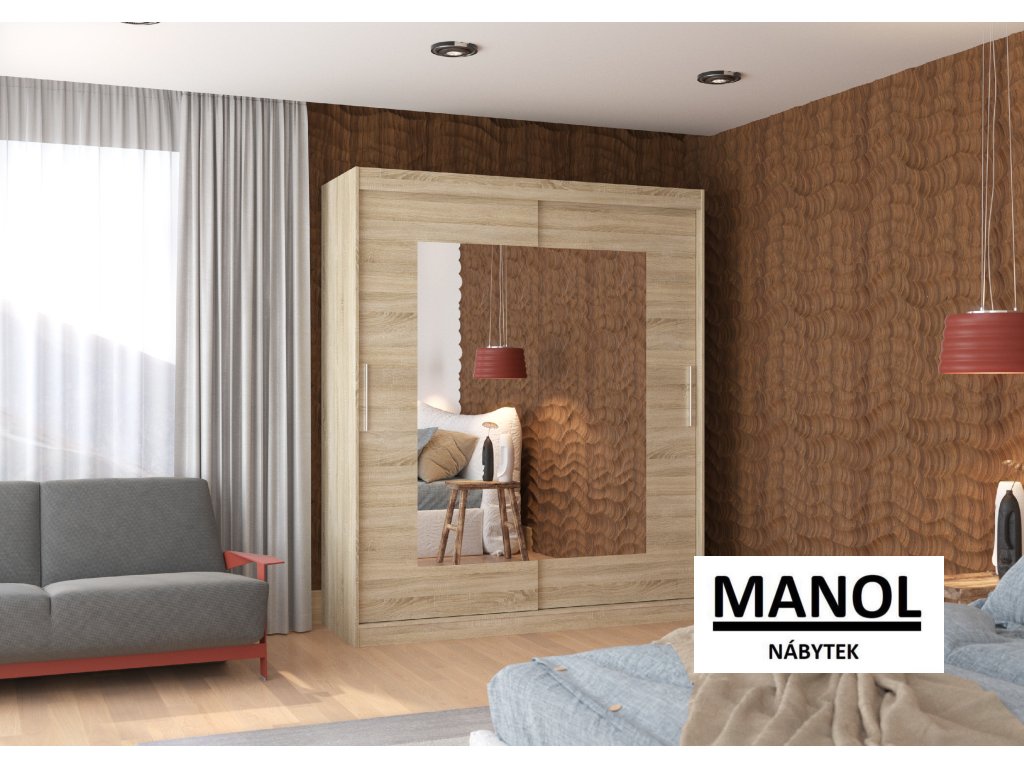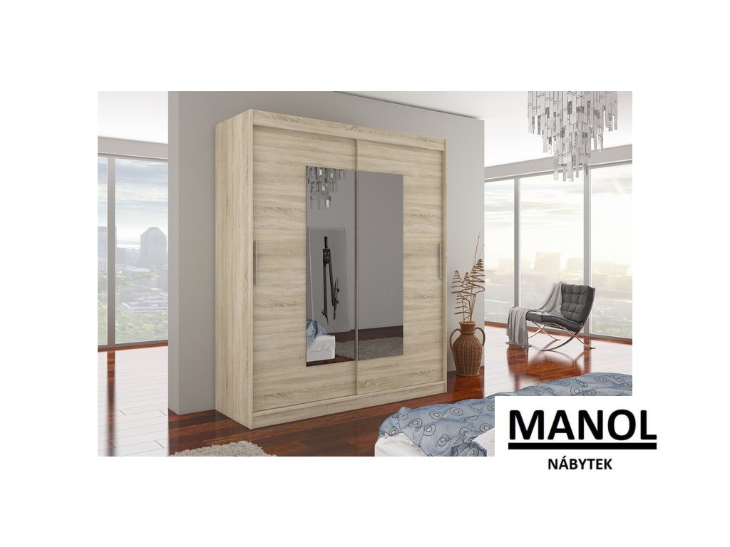 Posuvná šatní skříň ROSETTE se zrcadlem je ideálním způsobem, jak uspořádat svůj prostor. Nábytek je vybaven prostornými policemi a tyčí, na kterou můžete zavěsit šaty, obleky, svrchní oblečení nebo košile. Na přední straně jsou připevněna zrcadla, která opticky zvětšují prostor. Díky tomu, že je skříň posuvná, nemusíte pro otevírání dveří vyčlenit další prostor, což z ní činí ideální řešení pro malé místnosti nebo úzké chodby.Doplňkové parametry