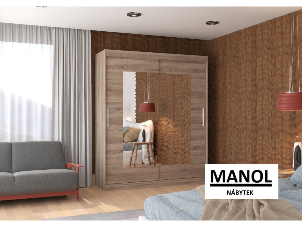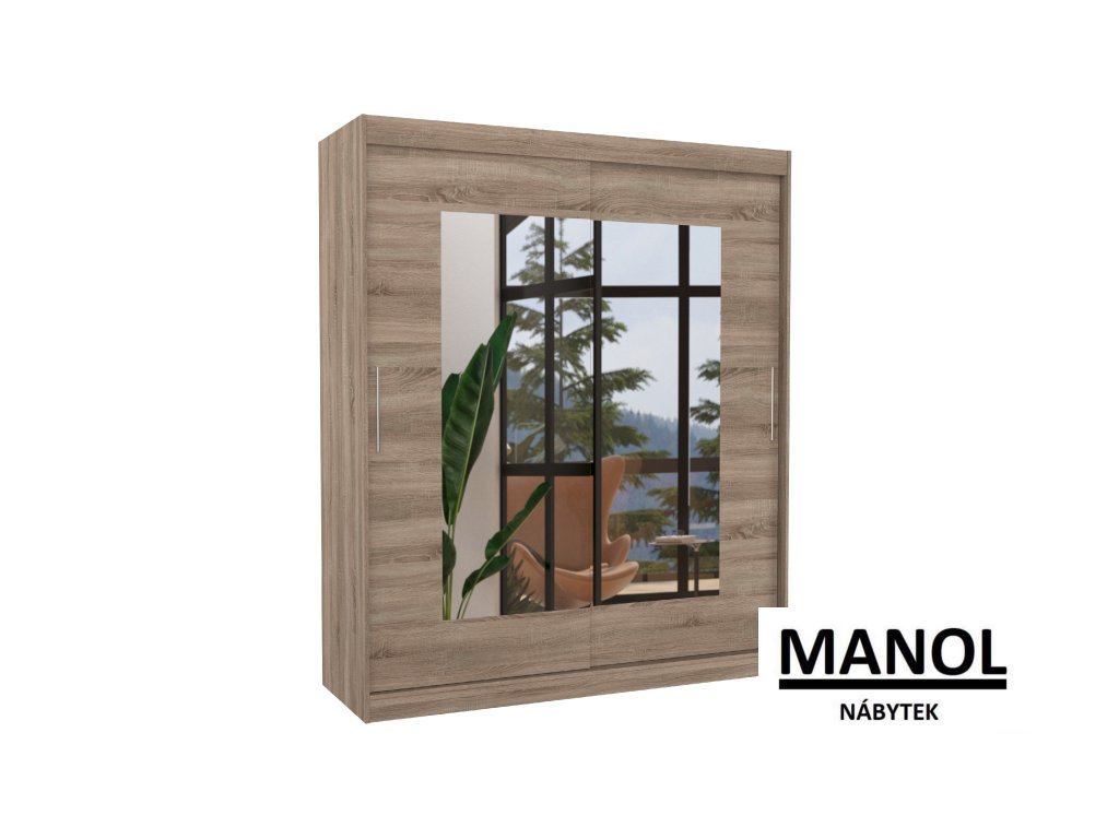 Posuvná šatní skříň ROSETTE se zrcadlem je ideálním způsobem, jak uspořádat svůj prostor. Nábytek je vybaven prostornými policemi a tyčí, na kterou můžete zavěsit šaty, obleky, svrchní oblečení nebo košile. Na přední straně jsou připevněna zrcadla, která opticky zvětšují prostor. Díky tomu, že je skříň posuvná, nemusíte pro otevírání dveří vyčlenit další prostor, což z ní činí ideální řešení pro malé místnosti nebo úzké chodby.Doplňkové parametry