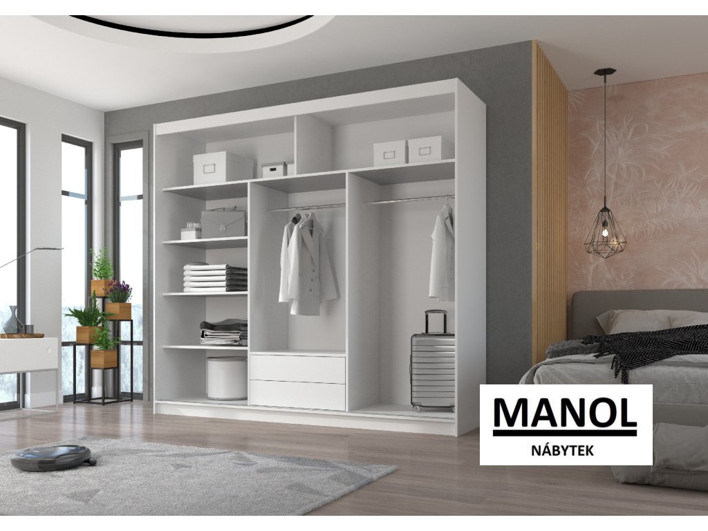 Posuvná šatní skříň ERWIN se zrcadlem je ideálním způsobem, jak uspořádat svůj prostor. Nábytek je vybaven prostornými policemi a tyčí, na kterou můžete zavěsit šaty, obleky, svrchní oblečení nebo košile. Na přední straně jsou připevněna zrcadla, která jednak opticky zvětšují prostor, jednak mu dodávají nádherný půvab. Díky tomu, že je skříň posuvná, nemusíte pro otevírání dveří vyčlenit další prostor, což z ní činí ideální řešení pro malé místnosti nebo úzké chodby.Doplňkové parametry