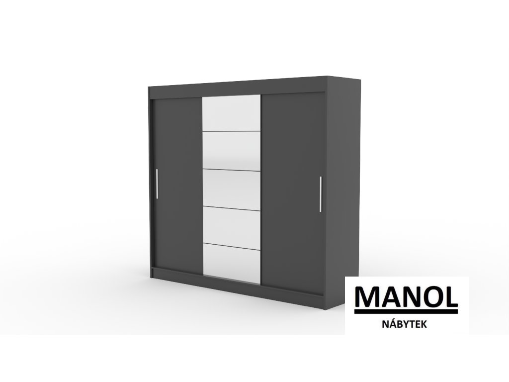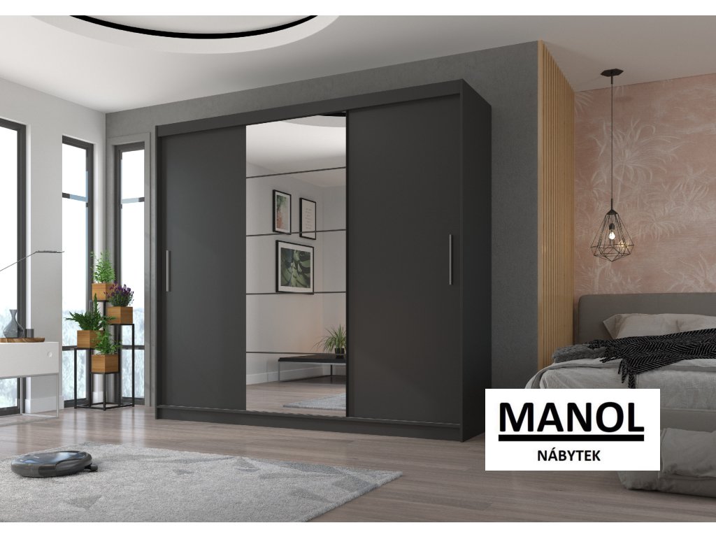 Posuvná šatní skříň ERWIN se zrcadlem je ideálním způsobem, jak uspořádat svůj prostor. Nábytek je vybaven prostornými policemi a tyčí, na kterou můžete zavěsit šaty, obleky, svrchní oblečení nebo košile. Na přední straně jsou připevněna zrcadla, která jednak opticky zvětšují prostor, jednak mu dodávají nádherný půvab. Díky tomu, že je skříň posuvná, nemusíte pro otevírání dveří vyčlenit další prostor, což z ní činí ideální řešení pro malé místnosti nebo úzké chodby.Doplňkové parametry
