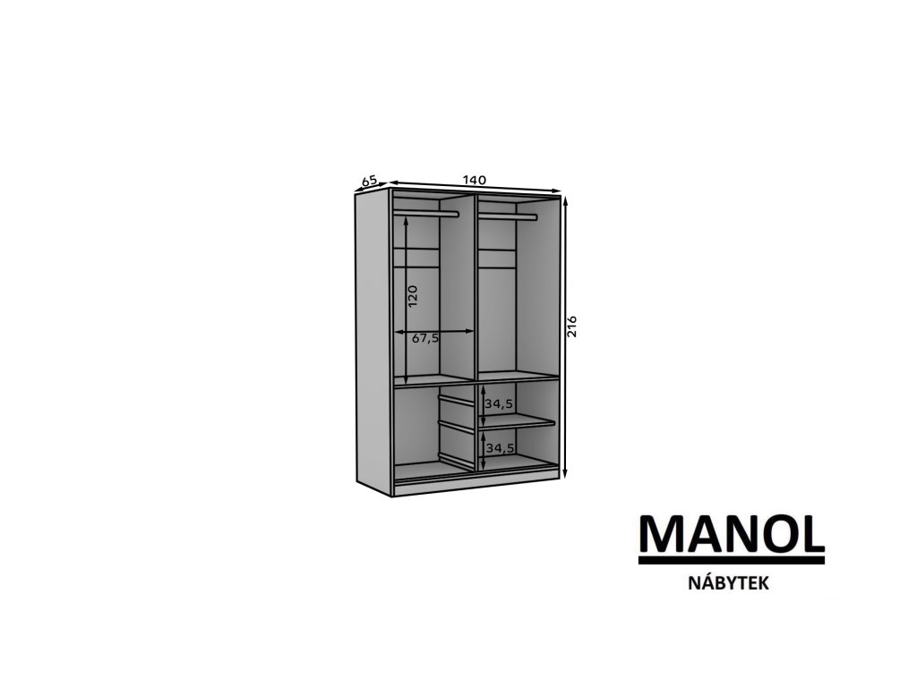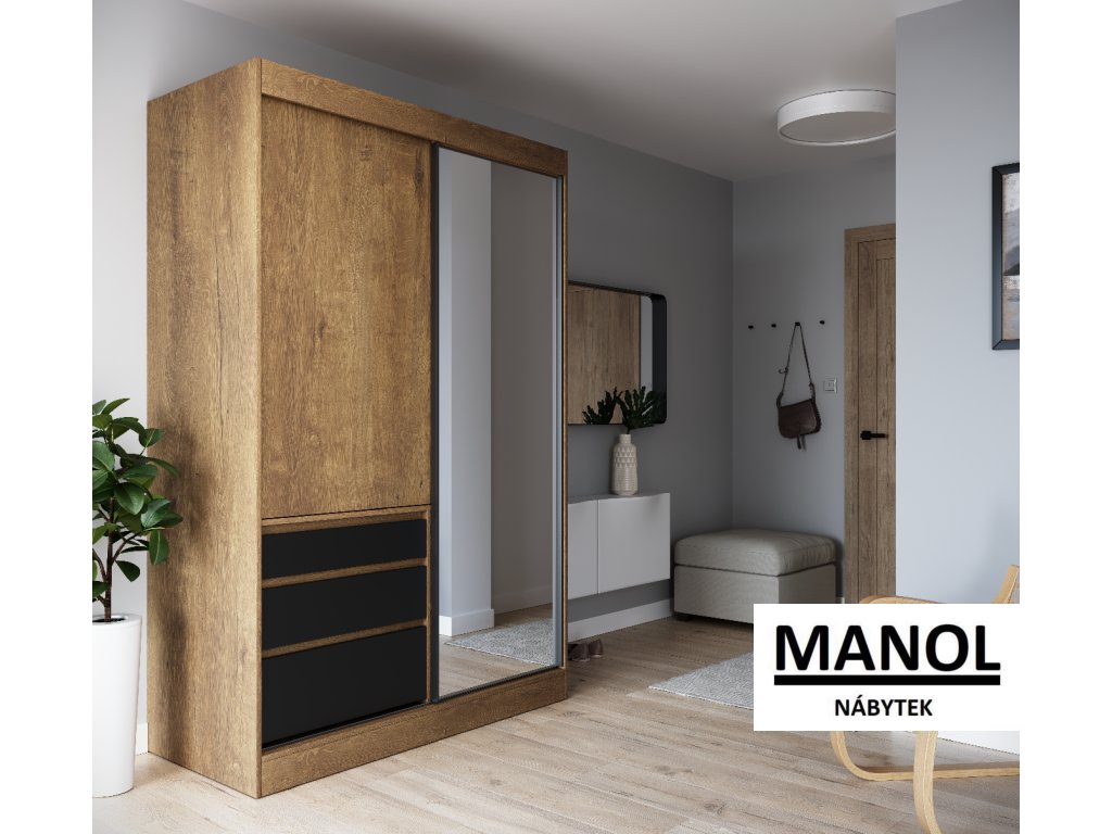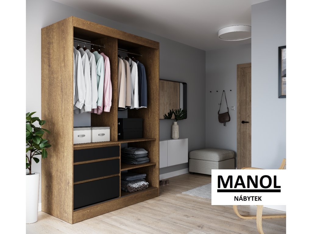 Posuvná skříň HAIDAR je ideální způsob, jak uspořádat prostor. Nábytek je vybaven prostornými policemi a zásuvkami, stejně jako tyčemi, na které můžete pověsit šaty, obleky, svrchní oděvy nebo košile. Díky posuvným dveřím není potřeba vyčleňovat další prostor pro jejich otevření, což z ní činí vynikající řešení pro malý pokoj nebo úzkou předsíň.Doplňkové parametry