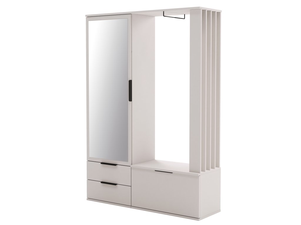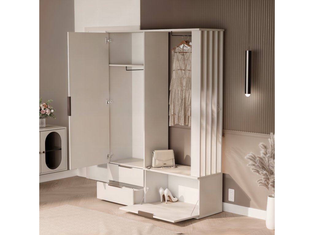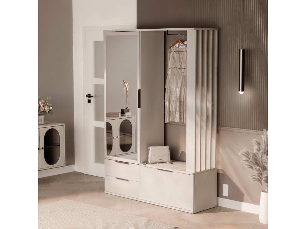 FARO je stylová a funkční předsíňová stěna, která zaujme svým moderním designem a decentním pískově béžovým dekorem. Díky chytrému uspořádání poskytuje vše potřebné pro pohodlný vstupní prostor a zároveň dodá interiéru elegantní vzhled.