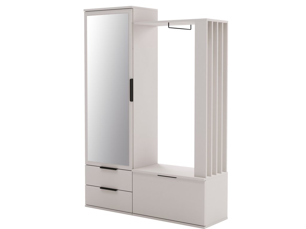 LAGOS je moderní předsíňová stěna, která zaujme na první pohled svým stylovým fashion dekorem v pískově béžové barvě. Spojuje elegantní vzhled s maximální praktičností a promyšleným úložným prostorem – ideální řešení pro každou vstupní halu či předsíň.