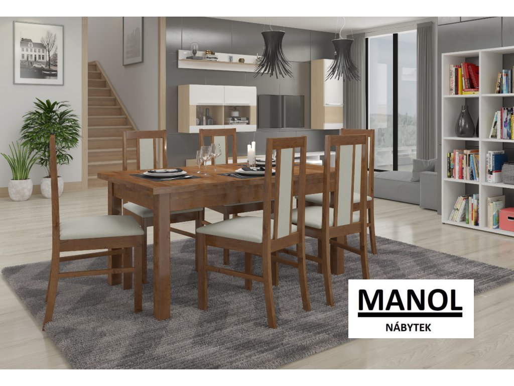 Sada RODOS 59 je ideálním řešením pro klasickou jADAlnii. Souprava obsahuje masivní stůl a šest pohodlných židlí. Stůl s jednoduchým tvarem umožní pohodlné usazení 6 osob. Nábytek je velmi elegantní a pohodlný. Vyberte si barvu a kolekci látek a navrhněte si soupravu svých snů.Doplňkové parametry