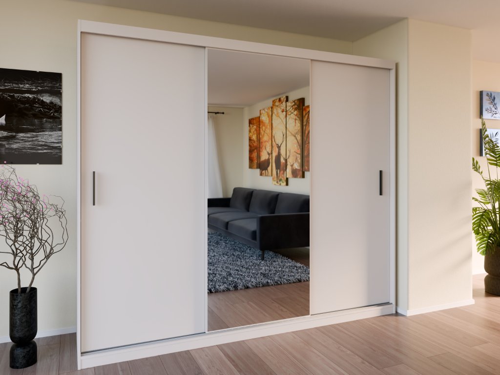 Rozměry:– výška 206 cm– šířka 150 cm– hloubka 62 cmBarvy:korpus: bílápřední část: zrcadla