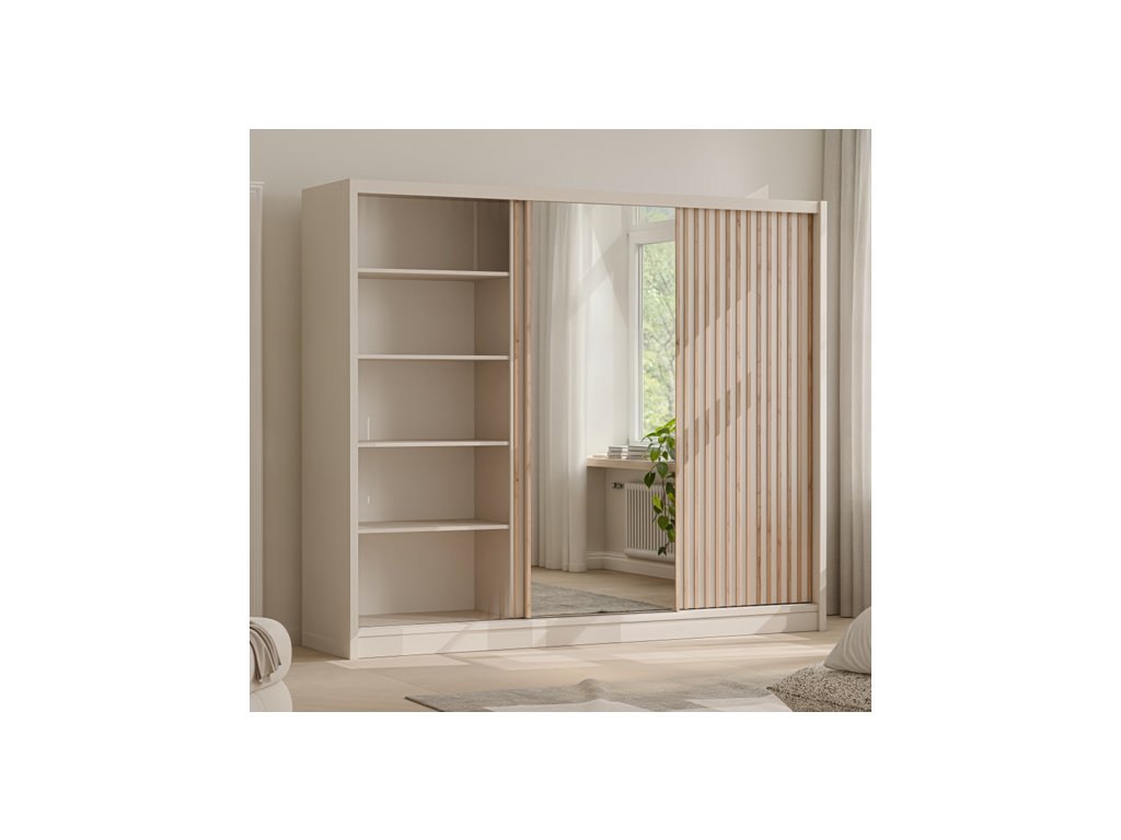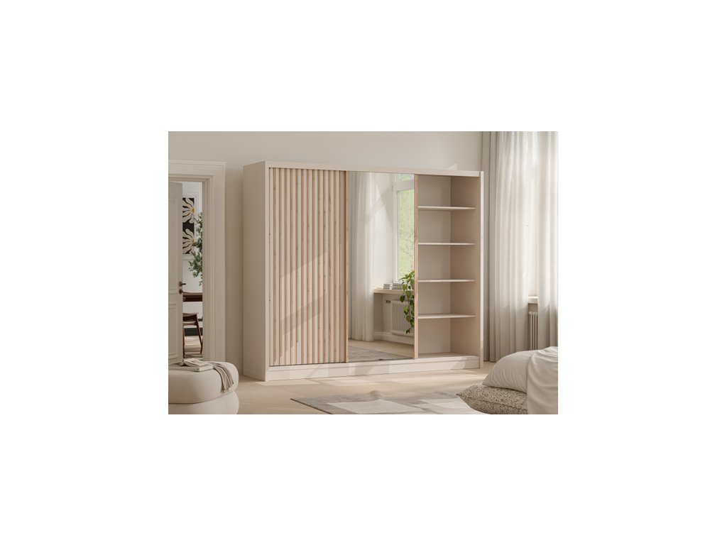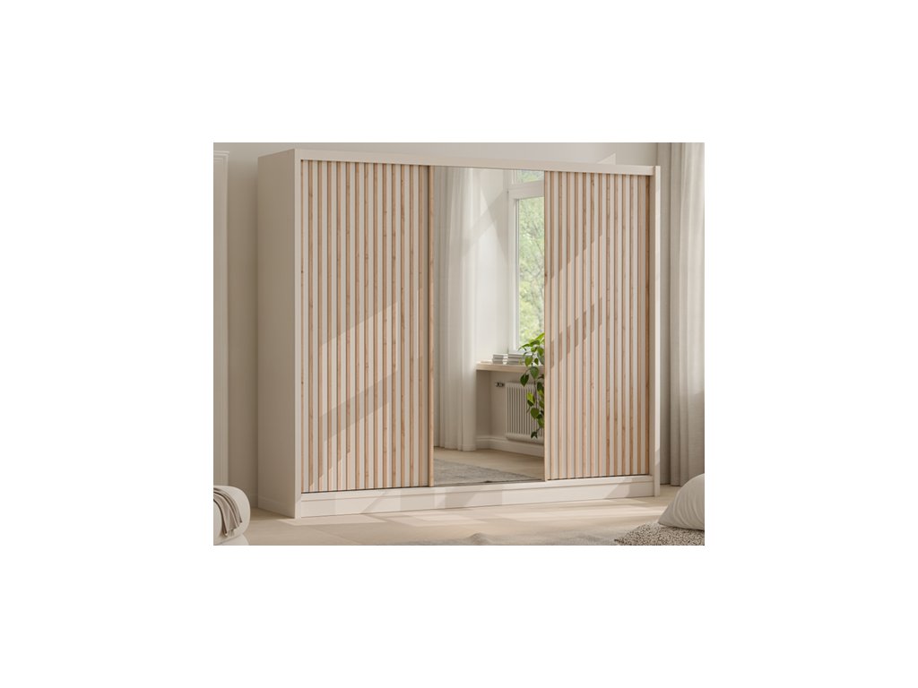 Moderní design, výjimečné řemeslné zpracování a nadčasová estetika – šatní skříň London 250 LUX je ideální volbou pro ty, kteří si ve svém každodenním životě cení stylu a pohodlí. Kombinace vertikálních ozdobných lamel s velkým zrcadlovým panelem vnáší do místnosti lehkost a prostornost a zároveň dodává nádech elegance. Díky chytrému uspořádání a prostornému interiéru je tato šatní skříň perfektním řešením pro ložnici, šatnu nebo chodbu a poskytuje dostatek prostoru pro oblečení a doplňky.