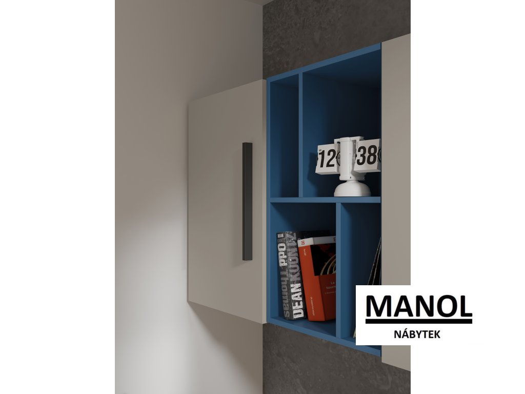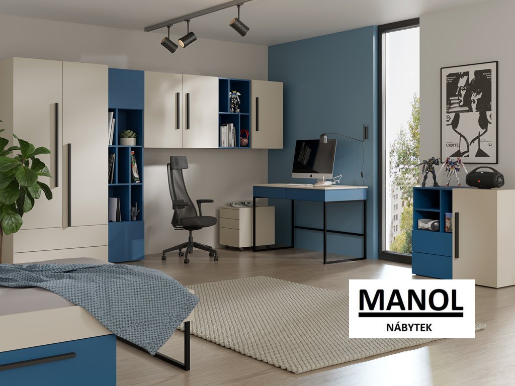 Moderní nábytková sestava do studentského nebo dětského pokoje kombinuje čistý design, praktické úložné prostory a příjemné barevné dekory. Díky promyšlenému řešení nabízí ideální prostředí pro studium, odpočinek i každodenní organizaci věcí. Minimalistické linie, dlouhé úchytky a kombinace dekorů vytvářejí elegantní a nadčasový vzhled, který se hodí do moderních interiérů.