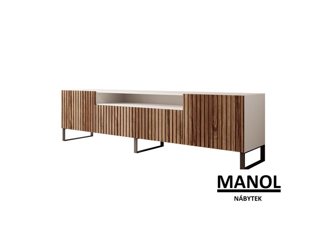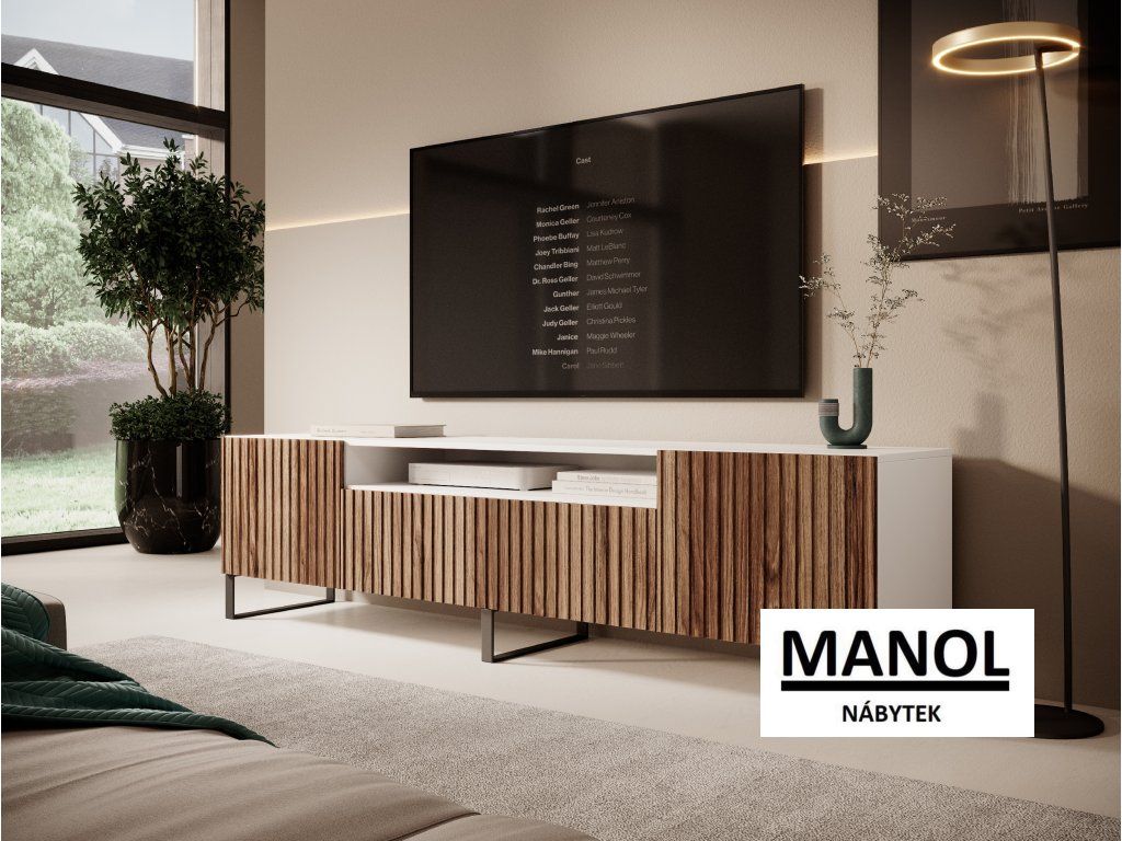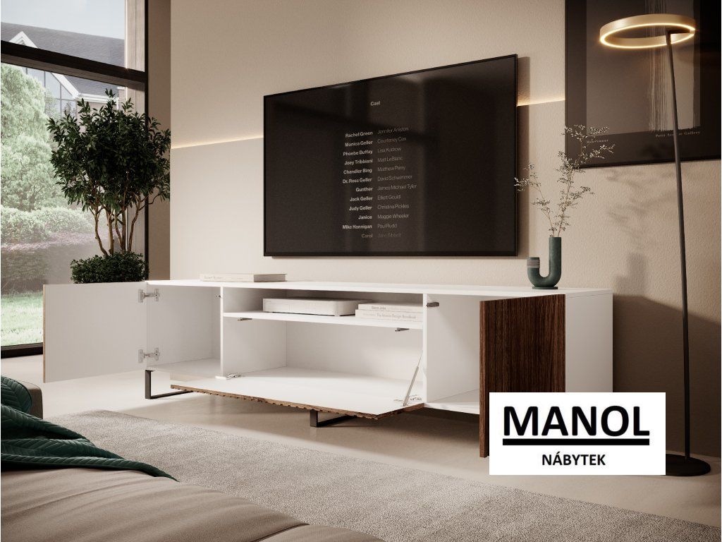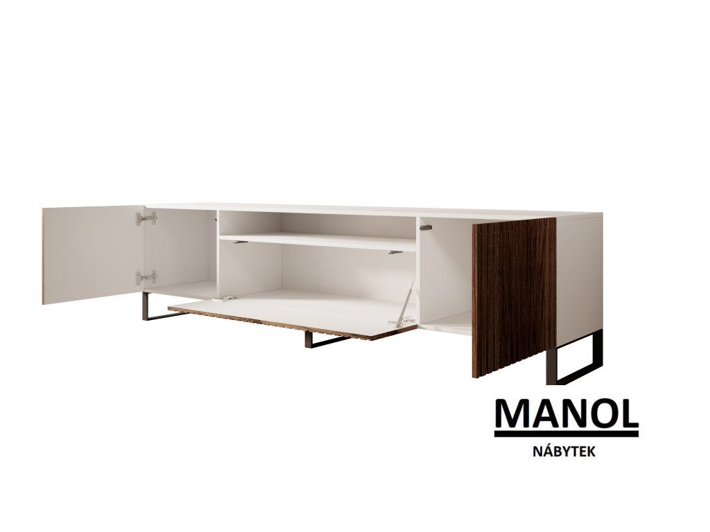 RTV skříňka Miro – moderní řešení pro váš obývací pokoj, které spojuje eleganci s funkčností. Model je dostupný ve dvou barevných variantách: klasické bílé s dekorem katania a stylové černé s dekorem katania, což umožňuje snadné sladění s různými interiérovými styly. RTV skříňka Miro je nabízena ve volně stojící i závěsné verzi, takže ji lze přizpůsobit vašemu prostoru a individuálním preferencím. Vysoce kvalitní materiály, včetně odolné laminované desky, zaručují nejen dlouhou životnost, ale také elegantní vzhled po mnoho let. Skříňka má prostorné police a praktické přihrádky, které pojmou veškerou RTV techniku a doplňky, čímž zajistí pořádek a snadný přístup k potřebným zařízením. RTV Miro je ideální volbou pro ty, kteří si cení stylu a pohodlí.Doplňkové parametry