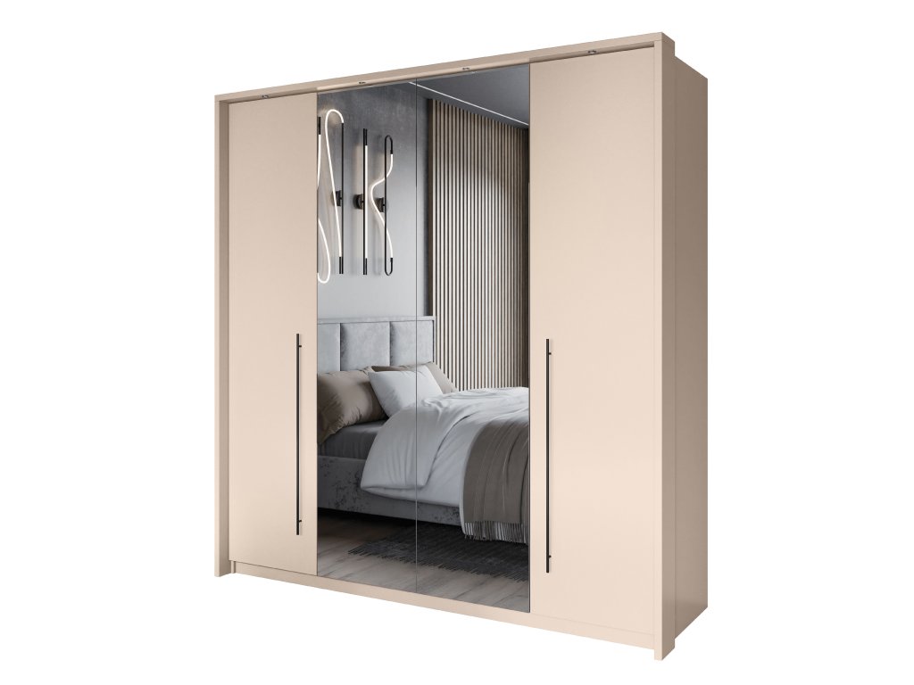Šatní skříň SAVANA nabízí perfektní spojení moderního stylu, funkčnosti a nadčasového designu. Elegantní pískově béžové provedení působí čistě a vzdušně, zatímco centrálně umístěné zrcadlové dveře dodávají skříni nejen estetickou hodnotu, ale i praktické využití – prosvětlí prostor a opticky jej zvětší.