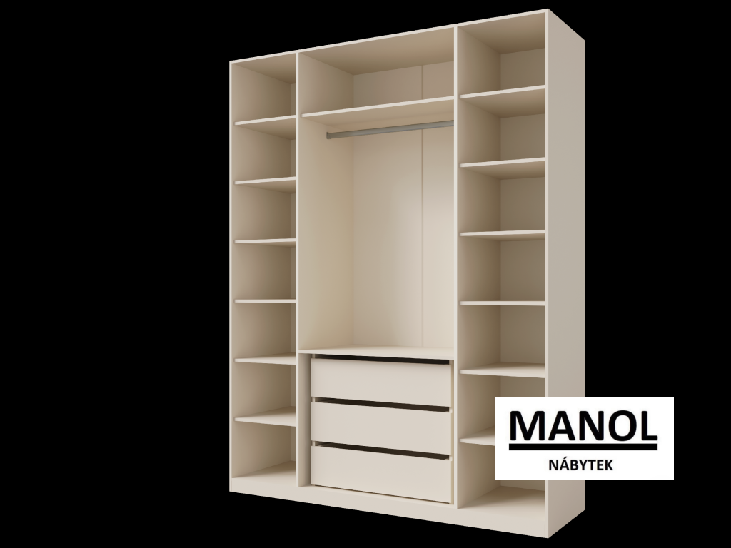 Díky variabilním šířkám 45, 90, 135 a 180 cm si snadno vyberete ideální rozměr přesně podle vašich potřeb. Kolekci navíc doplňuje praktický regál o šířce 58 cm, který rozšiřuje úložný prostor a nabízí další možnosti kombinace.