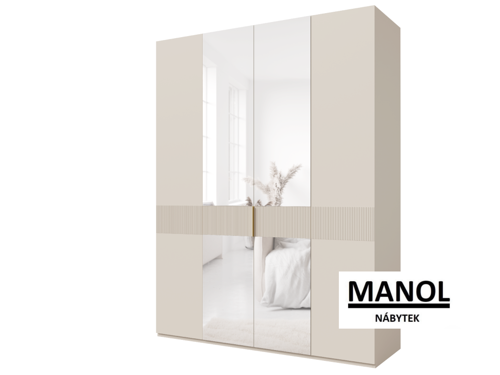 Rozměry:– výška 206 cm– šířka 150 cm– hloubka 62 cmBarvy:korpus: bílápřední část: zrcadla