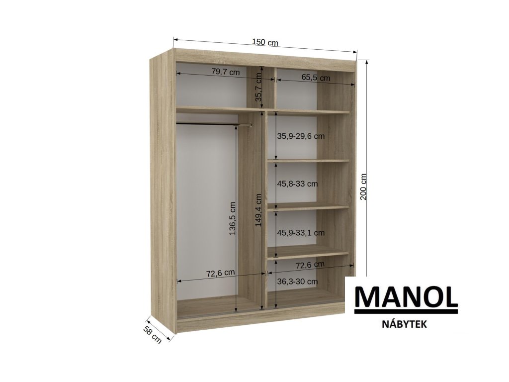 Posuvná skříň od společnosti MARTINEZ je ideálním způsobem, jak uspořádat svůj prostor. Nábytek je vybaven prostornými policemi a tyčí, na kterou můžete zavěsit šaty, obleky, svrchní oblečení nebo košile. Na přední straně se nacházejí ozdobné lacobely, které dodávají nábytku jedinečný styl. Díky tomu, že je skříň posuvná, nemusíte pro otevírání dveří vyčlenit další prostor, což z ní dělá ideální řešení do malého pokoje nebo úzké chodby.Doplňkové parametry