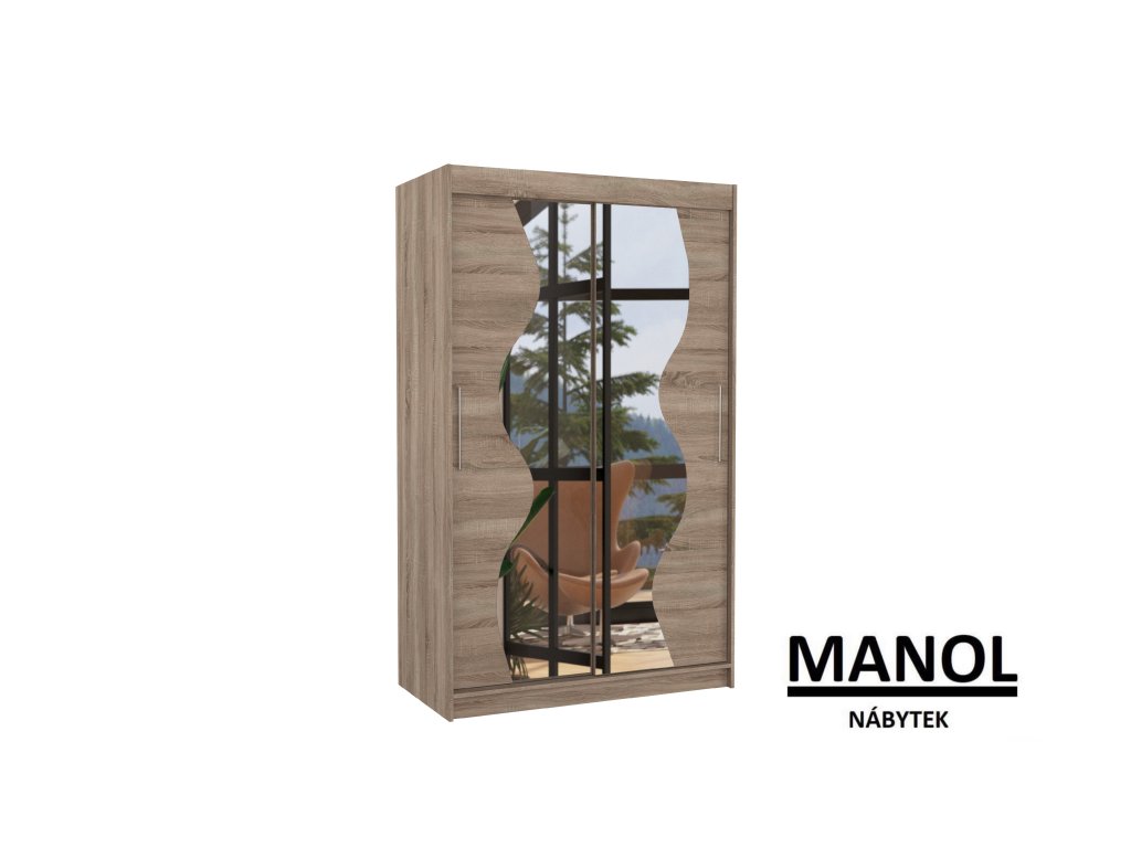 Posuvná skříň se zrcadlem OSWALD je ideálním způsobem, jak uspořádat svůj prostor. Nábytek je vybaven prostornými policemi a tyčí, na kterou můžete zavěsit šaty, obleky, svrchní oblečení nebo košile. Na přední straně jsou upevněna zrcadla ve tvaru vlny, která opticky zvětšují prostor a zároveň dodávají jedinečný styl. Díky tomu, že je skříň posuvná, nemusíte pro otevírání dveří vyčlenit další prostor, což z ní činí ideální řešení pro malé místnosti nebo úzké chodby.Doplňkové parametry