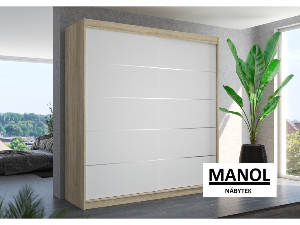 Posuvná skříň ESTEVA je ideálním způsobem, jak uspořádat svůj prostor. Nábytek je vybaven prostornými policemi a tyčí, na kterou můžete zavěsit šaty, obleky, svrchní oblečení nebo košile. Přední stranu zdobí ozdobné vodorovné pruhy ve stříbrné barvě, které dodávají nábytku jedinečný styl. Díky tomu, že je skříň posuvná, nemusíte pro otevírání dveří vyčlenit další prostor, což z ní dělá ideální řešení pro malé místnosti nebo úzké chodby.Doplňkové parametry