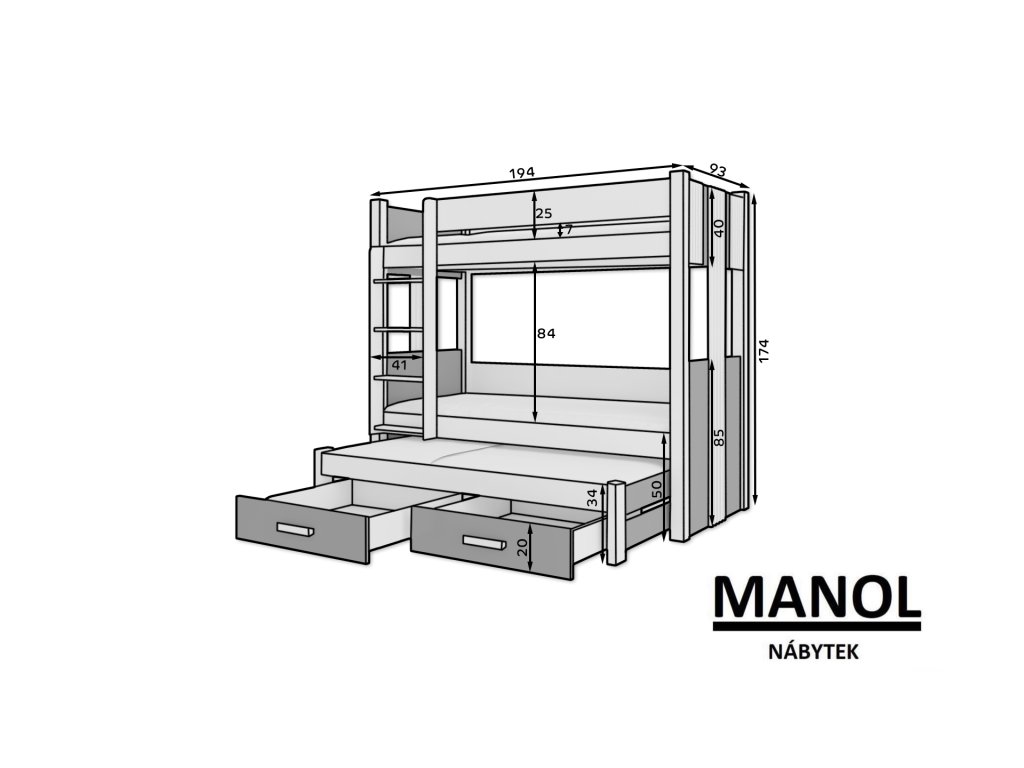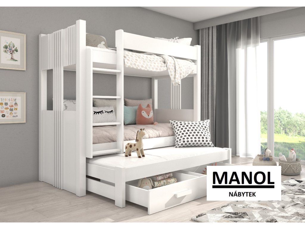 Patrová postel ARTEMA pro 3 osoby je skvělým nápadem, jak ušetřit místo v malém dětském pokoji. Nábytek má schůdky a dvě prostorné a funkční zásuvky na lůžkoviny. Matrace nejsou součástí postele.Doplňkové parametry