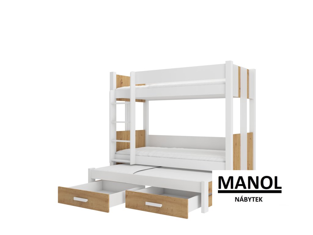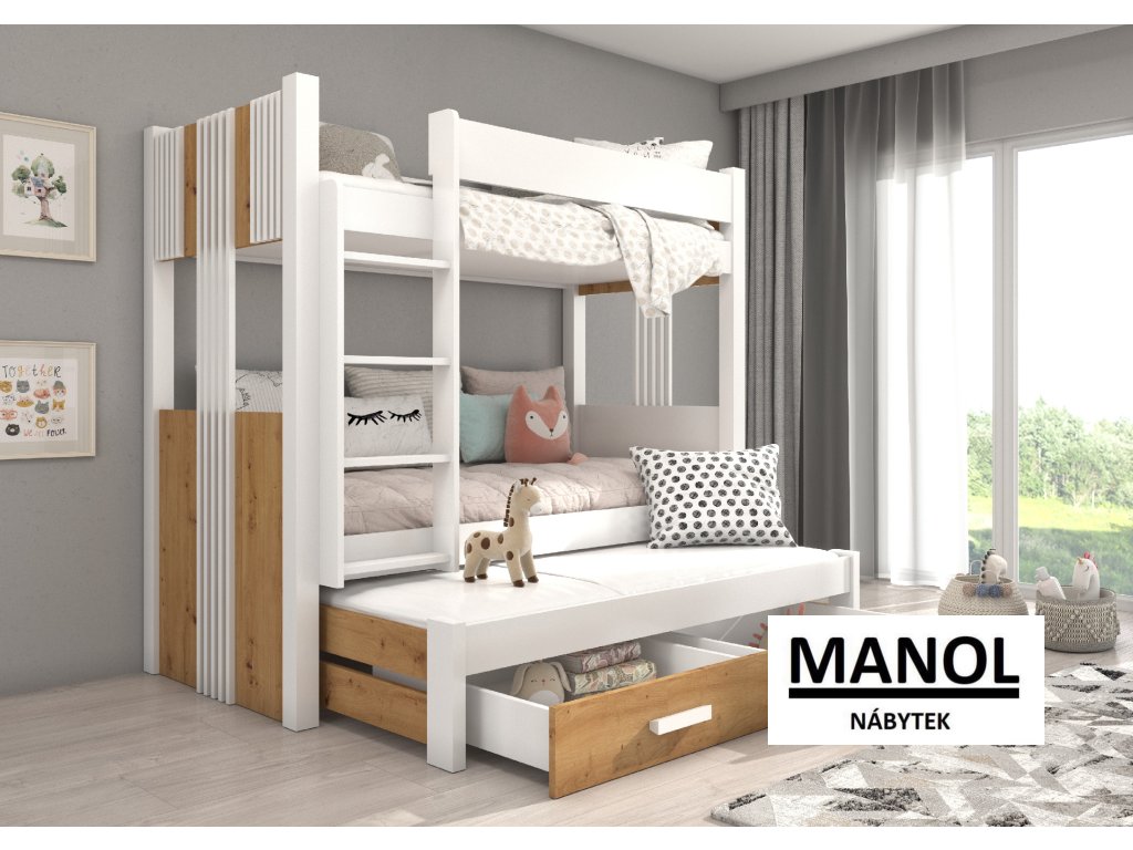 Patrová postel ARTEMA pro 3 osoby je skvělým nápadem, jak ušetřit místo v malém dětském pokoji. Nábytek má schůdky a dvě prostorné a funkční zásuvky na lůžkoviny. Matrace nejsou součástí postele.Doplňkové parametry