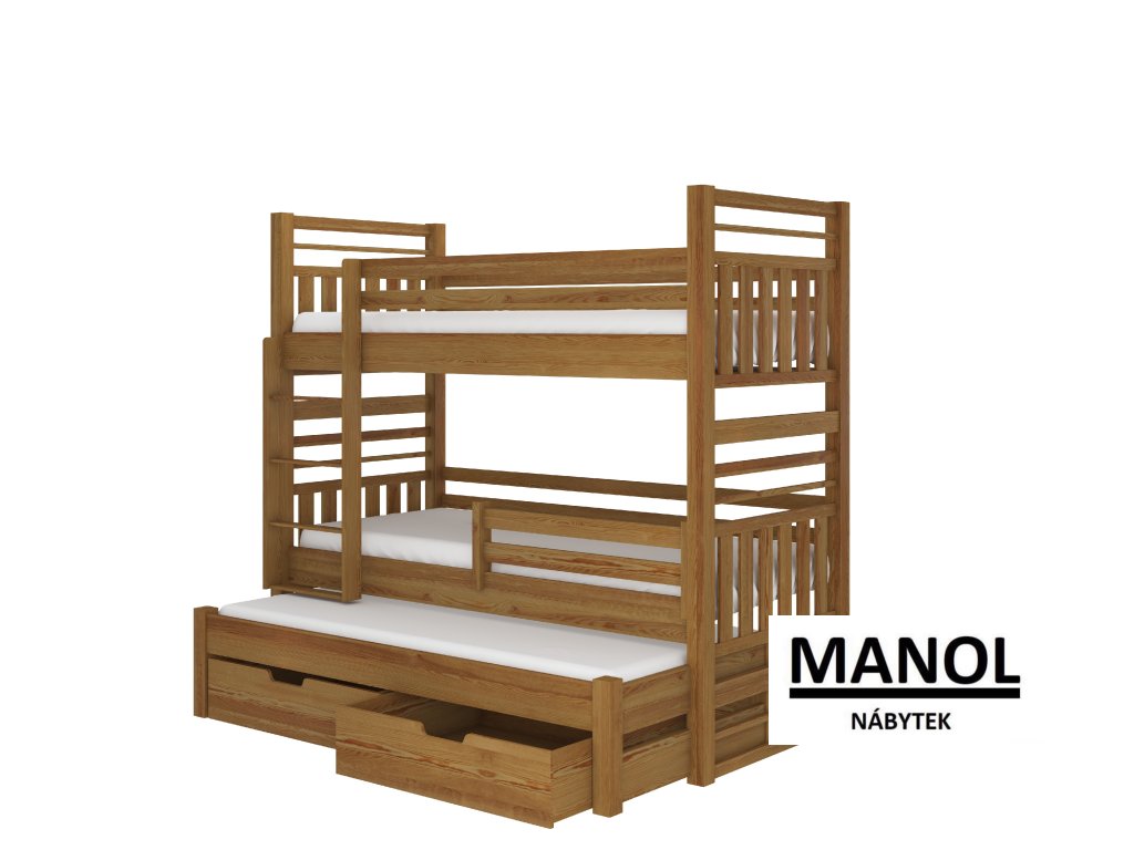 Patrová postel HIPPO pro 3 osoby je skvělý nápad, jak ušetřit místo v malém dětském pokoji. Nábytek má schůdky a dvě prostorné a funkční zásuvky na lůžkoviny. Kromě toho jsou na dvou úrovních zábradlí pro větší bezpečnost během spánku. Matrace nejsou součástí postele.Doplňkové parametry