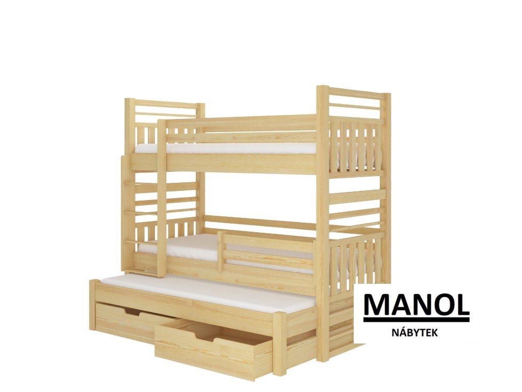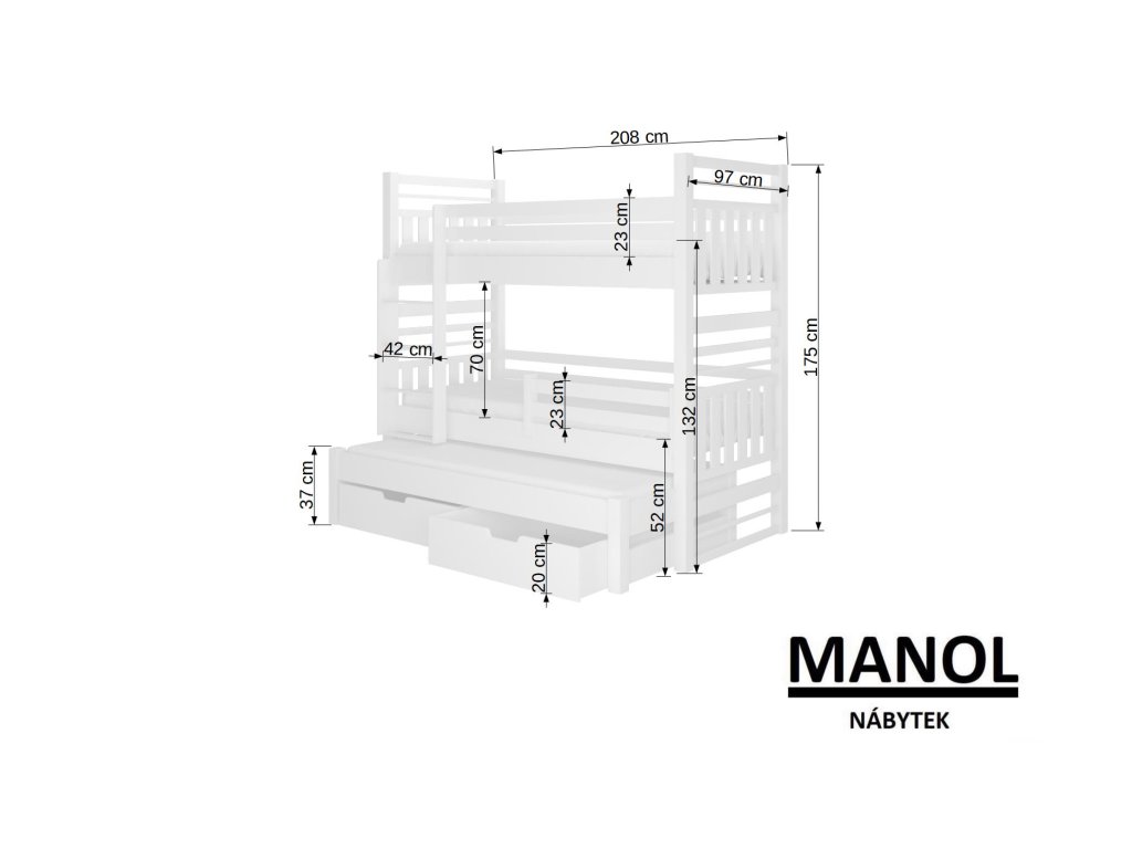 Patrová postel HIPPO pro 3 osoby je skvělý nápad, jak ušetřit místo v malém dětském pokoji. Nábytek má schůdky a dvě prostorné a funkční zásuvky na lůžkoviny. Kromě toho jsou na dvou úrovních zábradlí pro větší bezpečnost během spánku. Matrace nejsou součástí postele.Doplňkové parametry