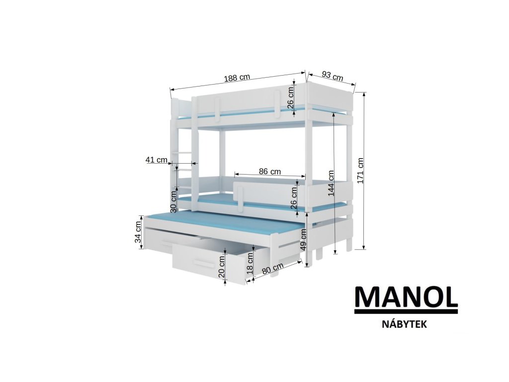 Třípatrová postel pro tři osoby s matracemi ETAPO 180x80 Třípatrová postel pro tři osoby ETAPO