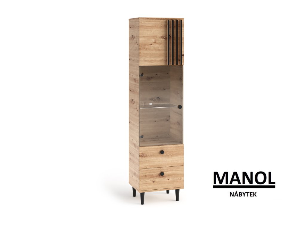 Vysoká vitrína z kolekce LIVIA v moderním stylu rozhodně upoutá pozornost. Přírodní efekt dřeva je zvýrazněn doplňky a vložkami v černé barvě. Za prosklenými dvířky se nachází hluboká police, která vám umožní vystavit cenné suvenýry nebo rodinné fotografie, a objemná skříňka poskytne další úložný prostor. Doporučujeme vám seznámit se s dalšími prvky kolekce LIVIA.Doplňkové parametry