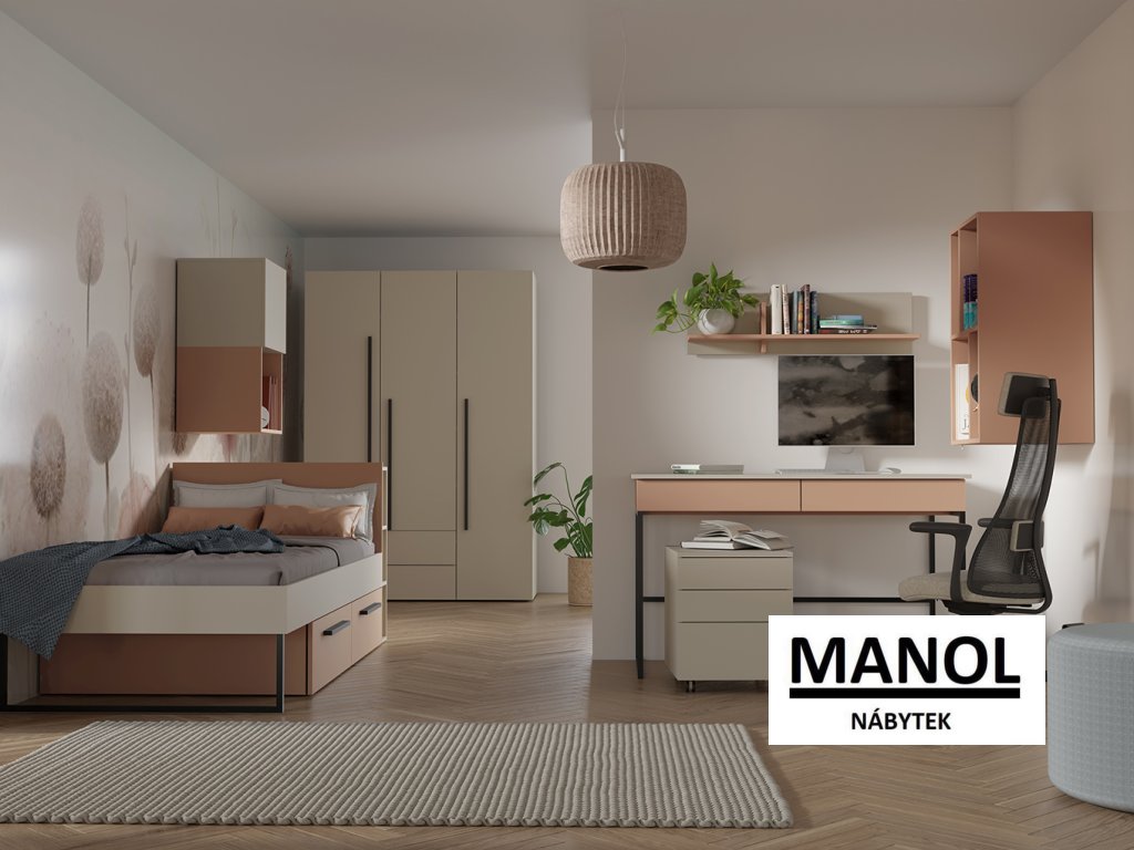 Sestava obsahuje prostornou šatní skříň, pohodlnou postel s úložným prostorem, psací stůl pro studium, nástěnné skříňky a otevřené police na knihy nebo dekorace. Díky tomu poskytuje dostatek místa pro oblečení, školní potřeby i osobní věci.