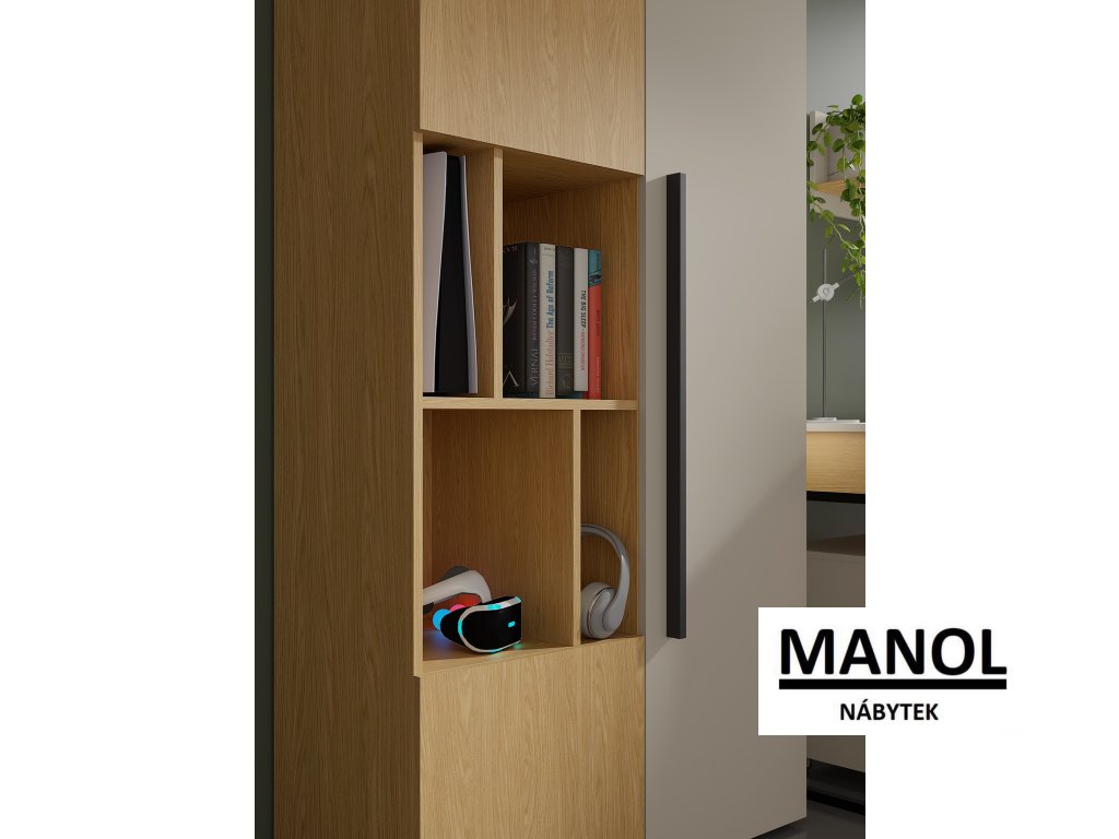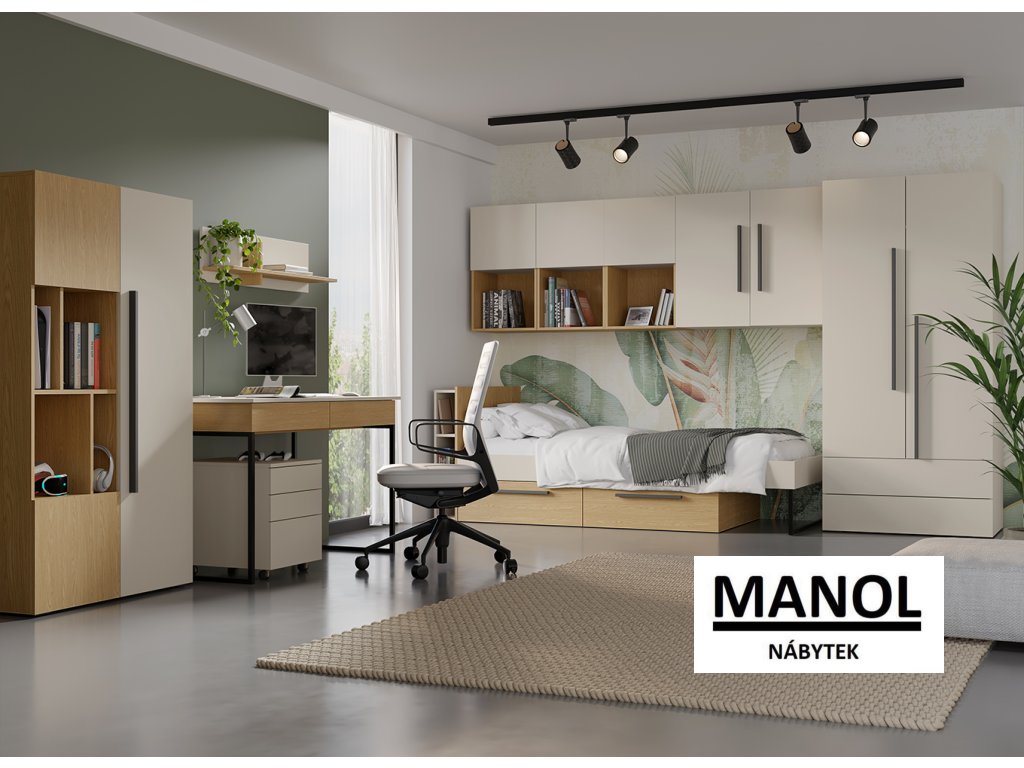 Moderní nábytková sestava do studentského nebo dětského pokoje kombinuje čistý design, praktické úložné prostory a příjemné barevné dekory. Díky promyšlenému řešení nabízí ideální prostředí pro studium, odpočinek i každodenní organizaci věcí. Minimalistické linie, dlouhé úchytky a kombinace dekorů vytvářejí elegantní a nadčasový vzhled, který se hodí do moderních interiérů.